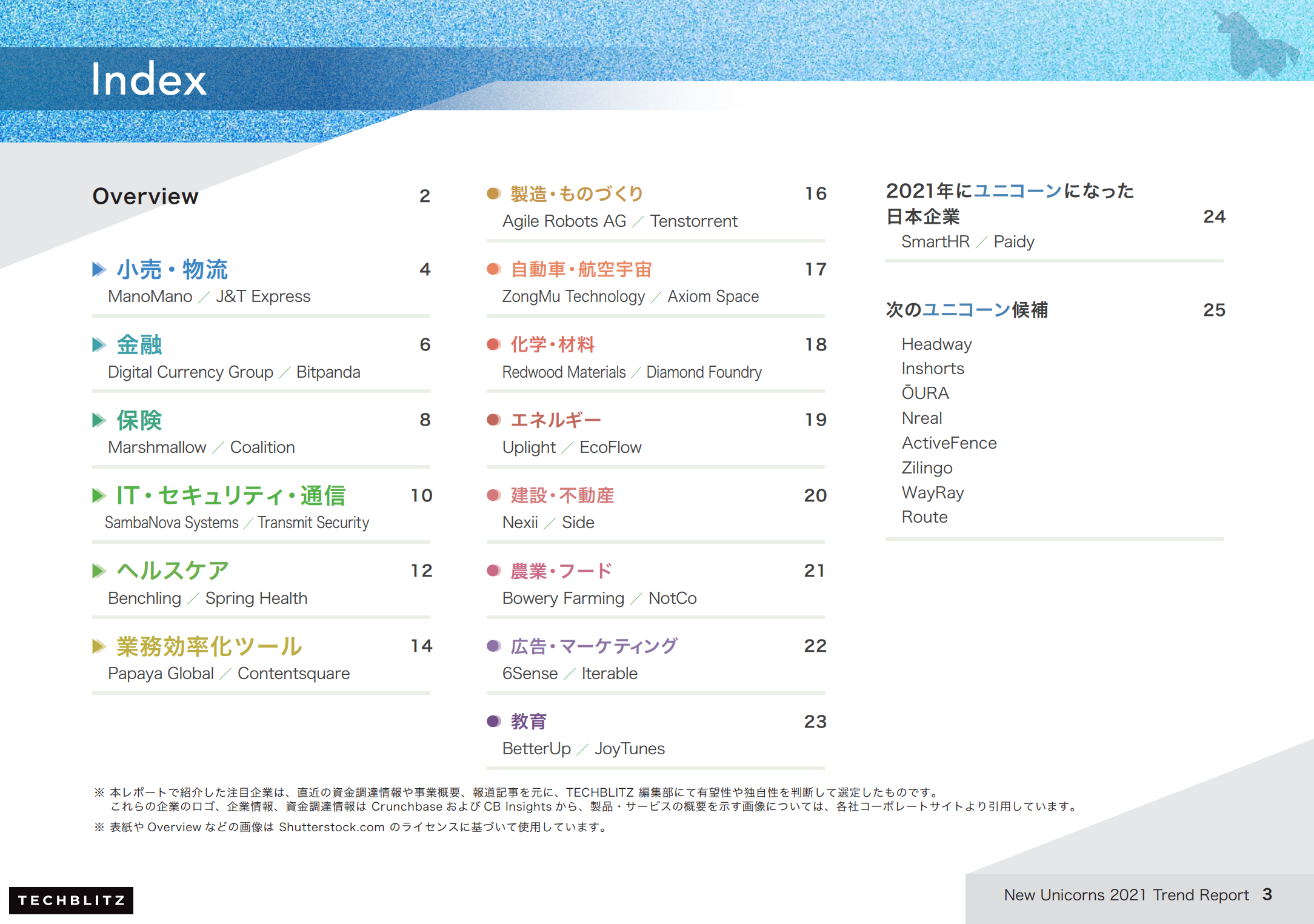 さて、本レポートでは、2021年に新たにユニコーンとなったスタートアップ**をTECHBLITZ独自のカテゴリーに分類し、その中からいくつかの企業をピックアップしてご紹介しています。特にユニコーンが多く誕生したカテゴリーについては、評価額トップ10リストも併せて掲載しています。レポートの最後には、2021年にユニコーンとなった日本のスタートアップと、今後ユニコーン化が近いとされている注目の企業もご紹介しています。