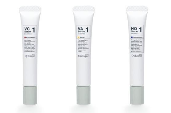 独自メソッド「クエスク式レベルアップ法」を採用し、ビタミンC、レチノール、ハイドロキノンを主成分とする3種類の美容液を展開。それぞれ、「初めての方用の<レベル1>」「高濃度に慣れた方用の<レベル2>」「強化ケア用の<レベル3>」