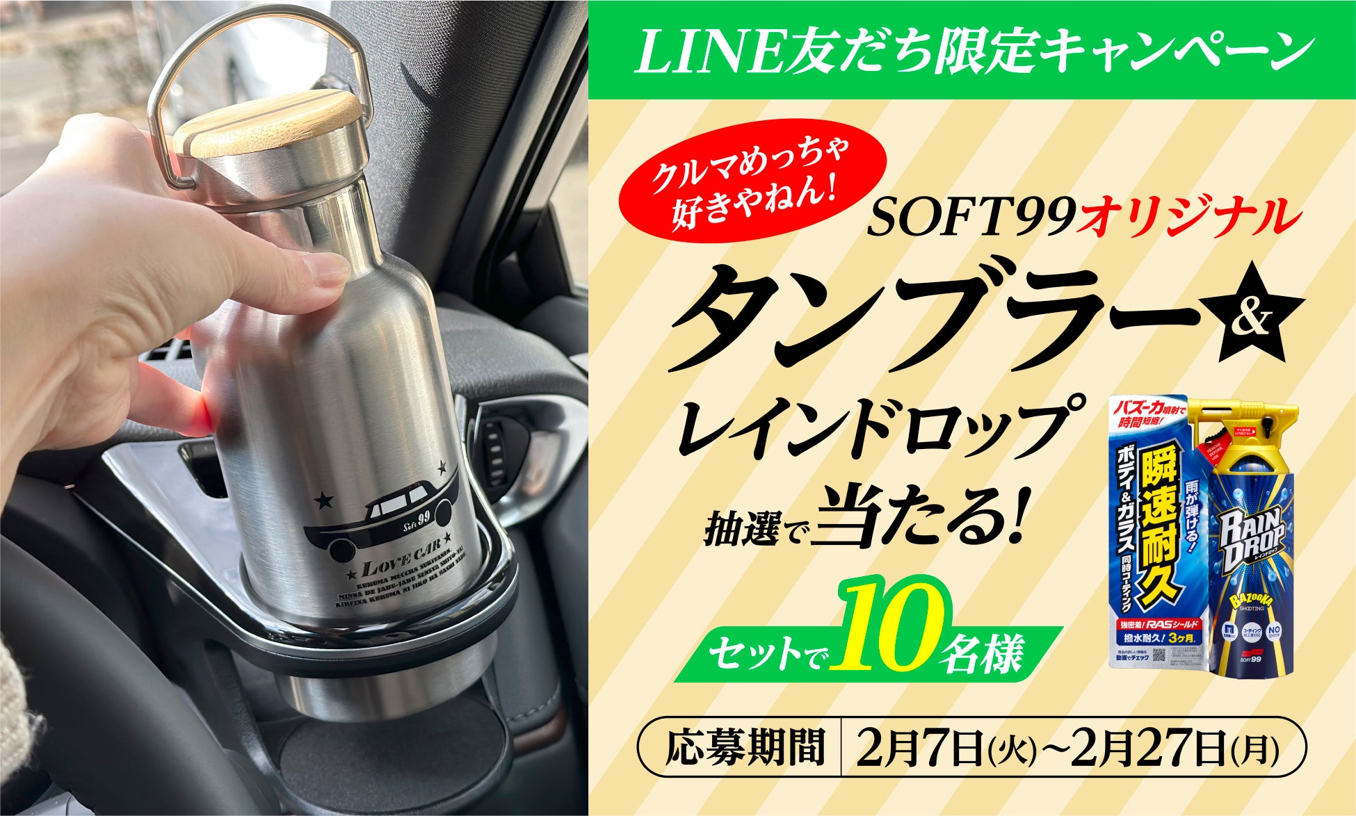 このたび、株式会社ソフト99コーポレーション(代表取締役社長:田中 秀明)は、LINEの友だち限定キャンペーンとして、洗車の合間や日常のリフレッシュタイムにも活用できる、愛車のドリンクホルダーにもぴったり納まるサイズの「クルマめっちゃ好きやねん!SOFT99オリジナルタンブラー」と、人気のコーティング剤『レインドロップ』のセットが抽選で10名様に当たるキャンペーンを2023年2月7日(火)より開催いたします。