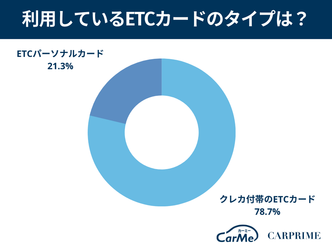 ETCカードを持っている方のうち、78.7%はクレジットカードに付帯するETCカードを所持していました。クレジット機能のないETCパーソナルカードも21.3%の方が利用しているようです。