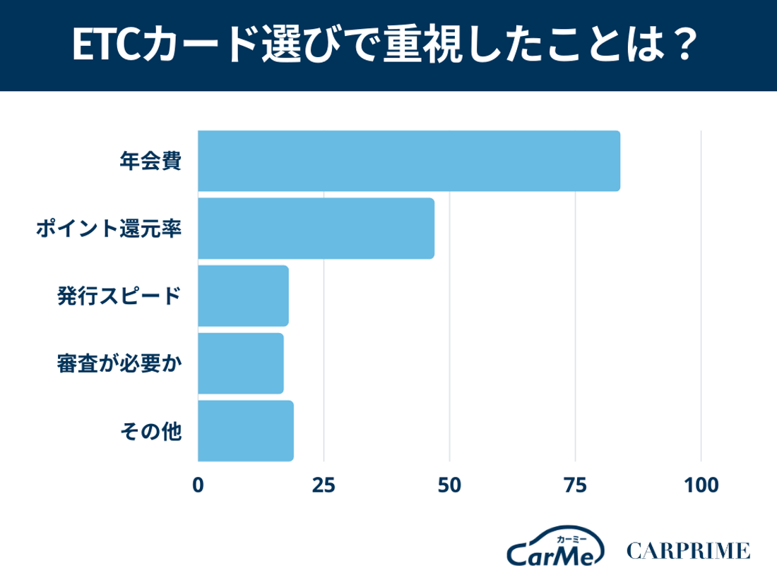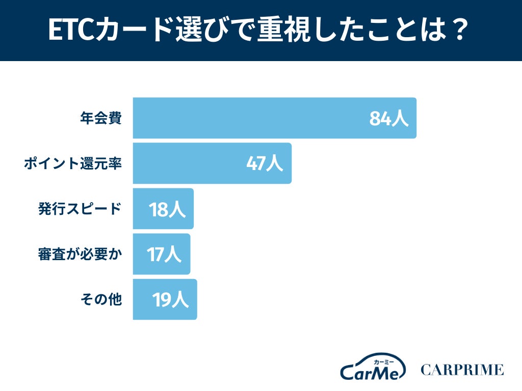 ETCカード選ぶで重視した点は、84名の方が重視すると答えた年会費が最多となりました。続いて、47名の方がポイント還元率が重要と回答しています。発行までにかかる日数(18名)、審査を受ける必要があるか(19名)、という2つのポイントを重視した人は少数派のようです。