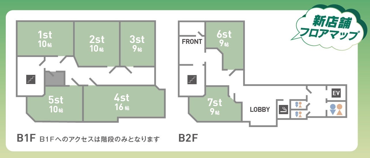 店内はB1Fに5部屋、B2Fに2部屋の全7部屋、2フロア構成で、用途に応じて選べる環境を整えております。