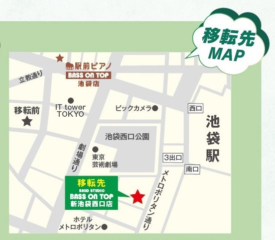 移転前はバンドスタジオとピアノスタジオが併設されていましたが、移転後はバンドスタジオのみで運営をし、2025年8月12日に駅前ピアノベースオントップ池袋店をオープンしており、池袋西口エリアではバンドスタジオとピアノスタジオで店舗が分かれた形態で展開してまいります。