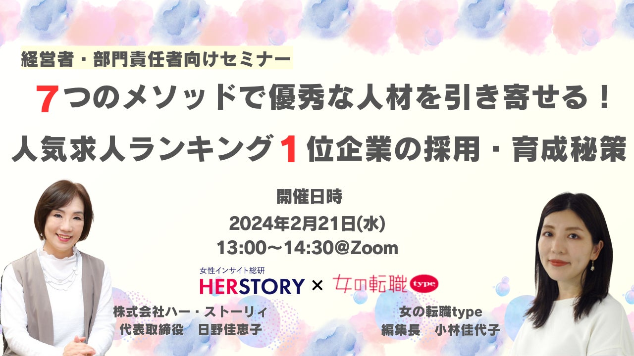 女性視点マーケティングNO.1のHERSTORY×女の転職typeコラボセミナー『7つのメソッドで優秀な人材を引き寄せる!人気求人ランキング1位企業の採用・育成秘策』2/21(水)無料開催