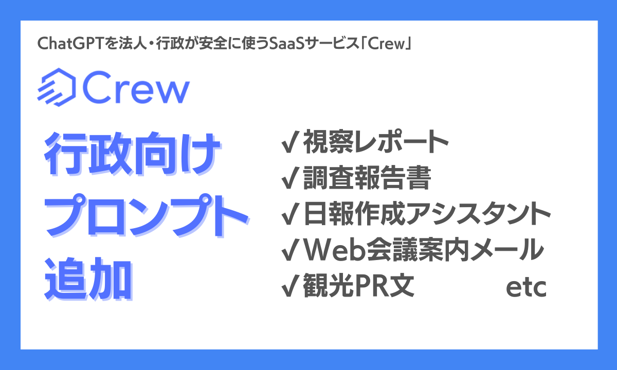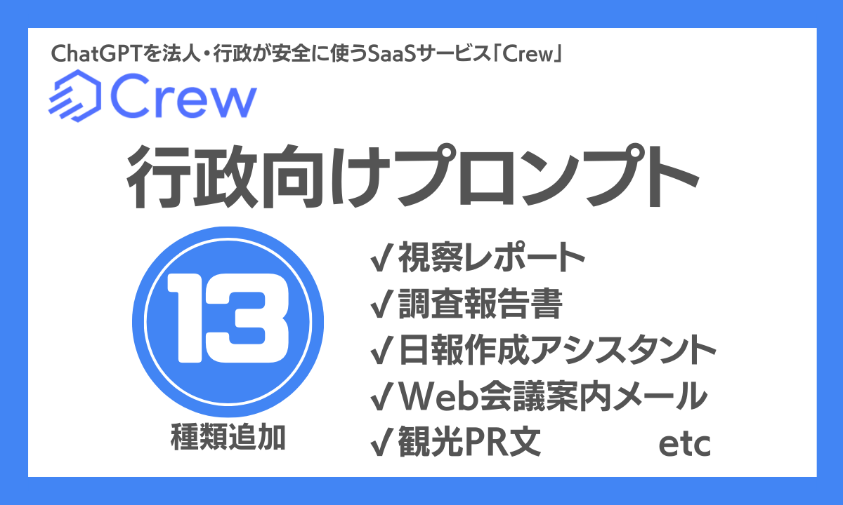 プロンプト13種類追加!ChatGPTをビジネスで安全に活用する業務効率化ツール「Crew」、視察レポートや調査報告書など行政実務に特化したプロンプトテンプレートを35種類標準装備