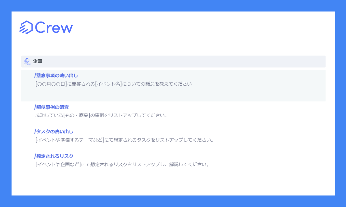 参照:新機能!ChatGPT をビジネスで安全に活用する業務効率化ツール「Crew」にてプロンプトテンプレート機能をリリース