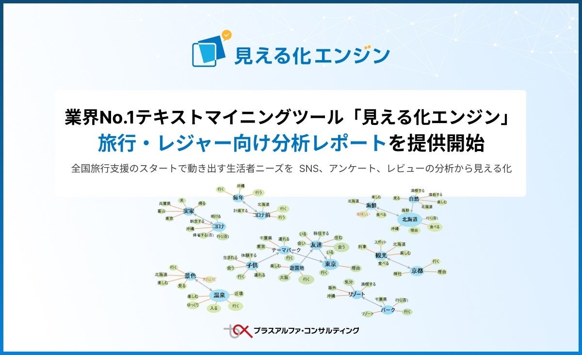 株式会社プラスアルファ・コンサルティング(本社:東京都港区、代表取締役社長:三室克哉、証券コード:4071)は、政府が推進する「全国旅行支援」や「GoToトラベル」、および回復が想定される旅行・レジャー需要などを背景に、10年連続国内シェアNo.1(※1)のSaaS型テキストマイニングツール「見える化エンジン」において、旅行・レジャーに関連した生活者インサイトを把握する分析レポートの提供を開始します。