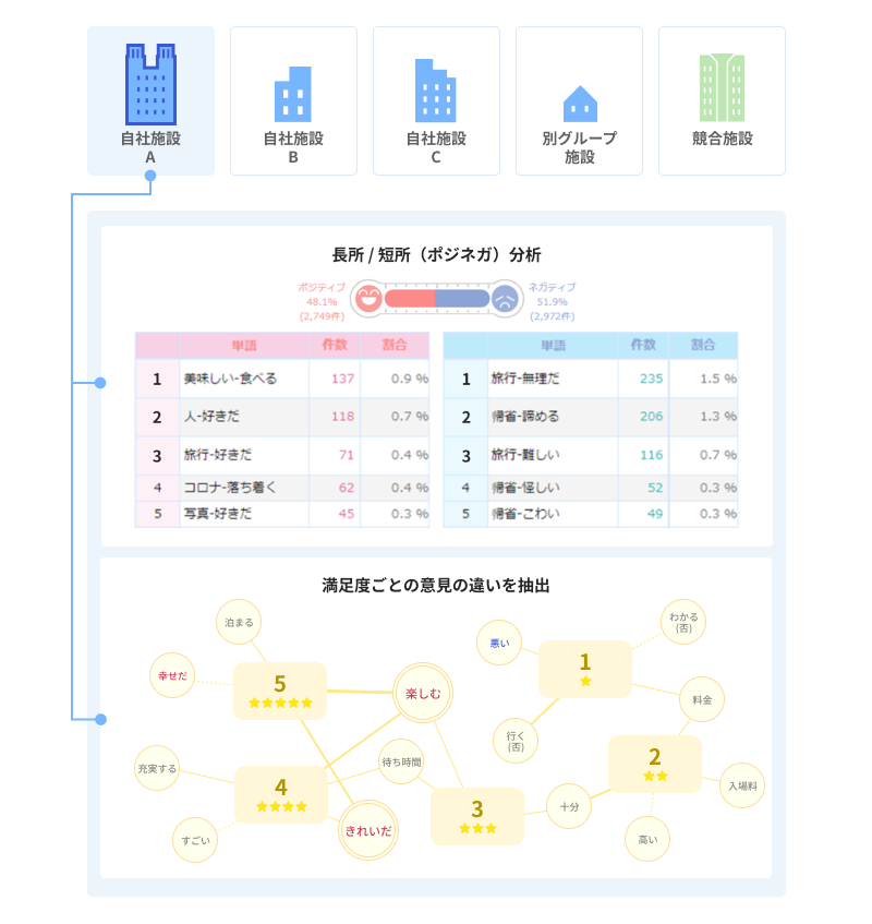 3.【ホテル・レジャー運営向け】施設のCS要因、宿泊サービス改善点の抽出(データソース例:アンケート、レビュー)