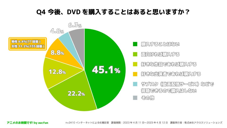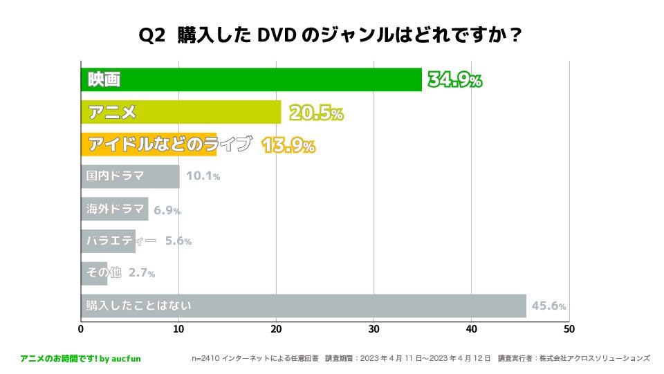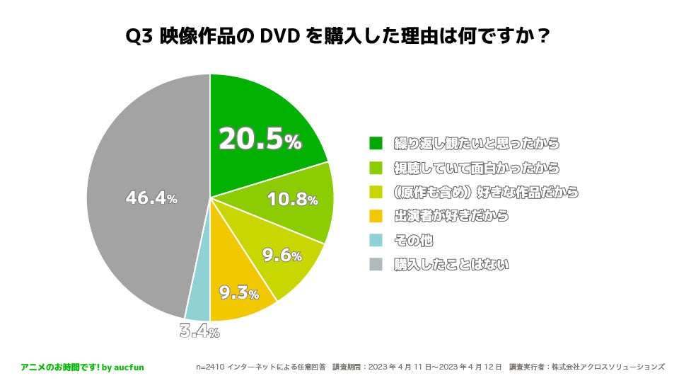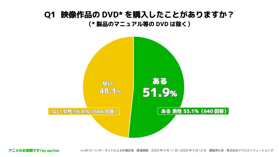 そこで、株式会社アクロスソリューションズと株式会社オークファンが共同運営しているアニメのお時間です!(URL:https://aucfan.com/vod/)は、20歳〜59歳の男女2410人を対象に「映像作品のDVDの購入と視聴に関するアンケート調査」を実施しました。