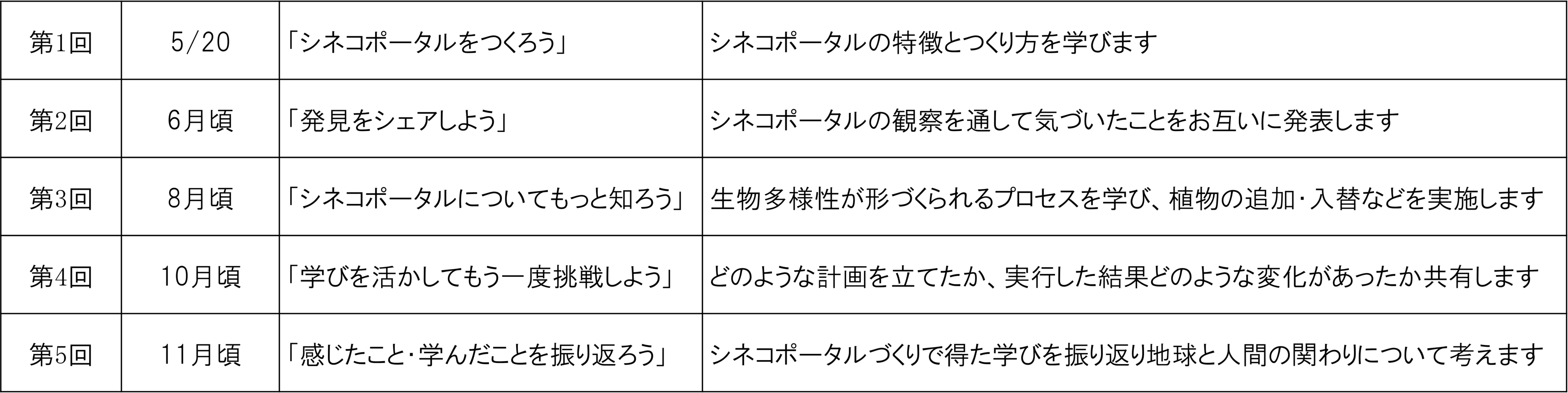 本ワークショップでは、全国各地の小学生・中学生に、約7ヵ月間シネコポータルづくりに挑戦してもらいます。子どもたちは、植物の成長やそこに生息する生物の観察記録をつけ、全5回のオンラインワークショップの中でそれぞれがつくったシネコポータルの成長について共有を行います。