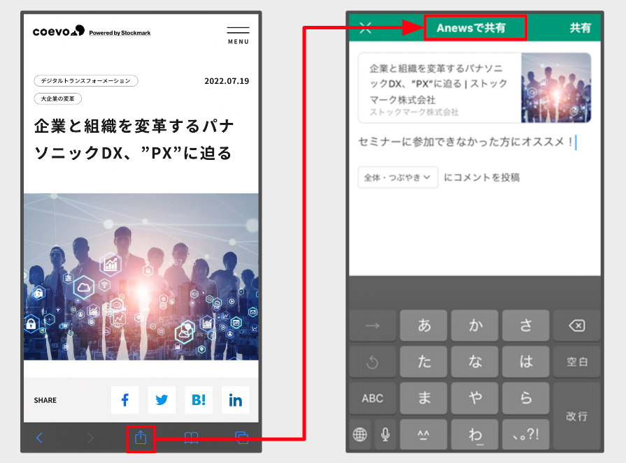スマートフォンで発見した記事やWEBサイトの「共有」ボタンを押すと、Anewsへの共有が可能になりました。URLの共有と合わせて、コメントを付けて投稿することも可能です。