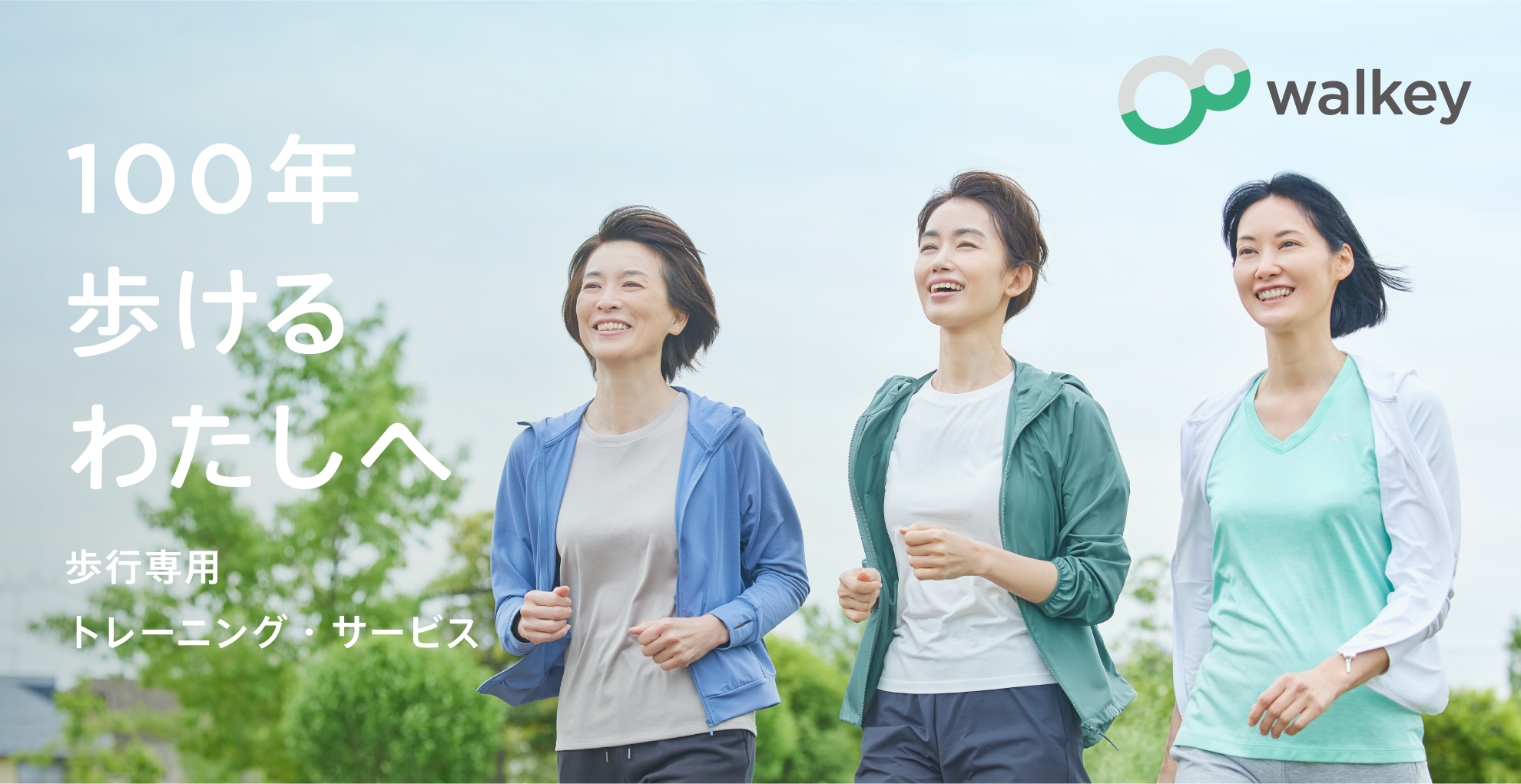 walkeyは、100年歩ける⾝体を作るための“歩⾏専⽤”トレーニングサービスです。⼈⽣100年時代と⾔われるようになった昨今ですが、その⼀⽅で注⽬されるようになったのが健康寿命という考え⽅です。⼈の寿命⾃体は伸びていくと考えられている中で、その⻑い⼈⽣を豊かに過ごすためには、いつまでも健康でいることが今まで以上に重要視されるようになります。