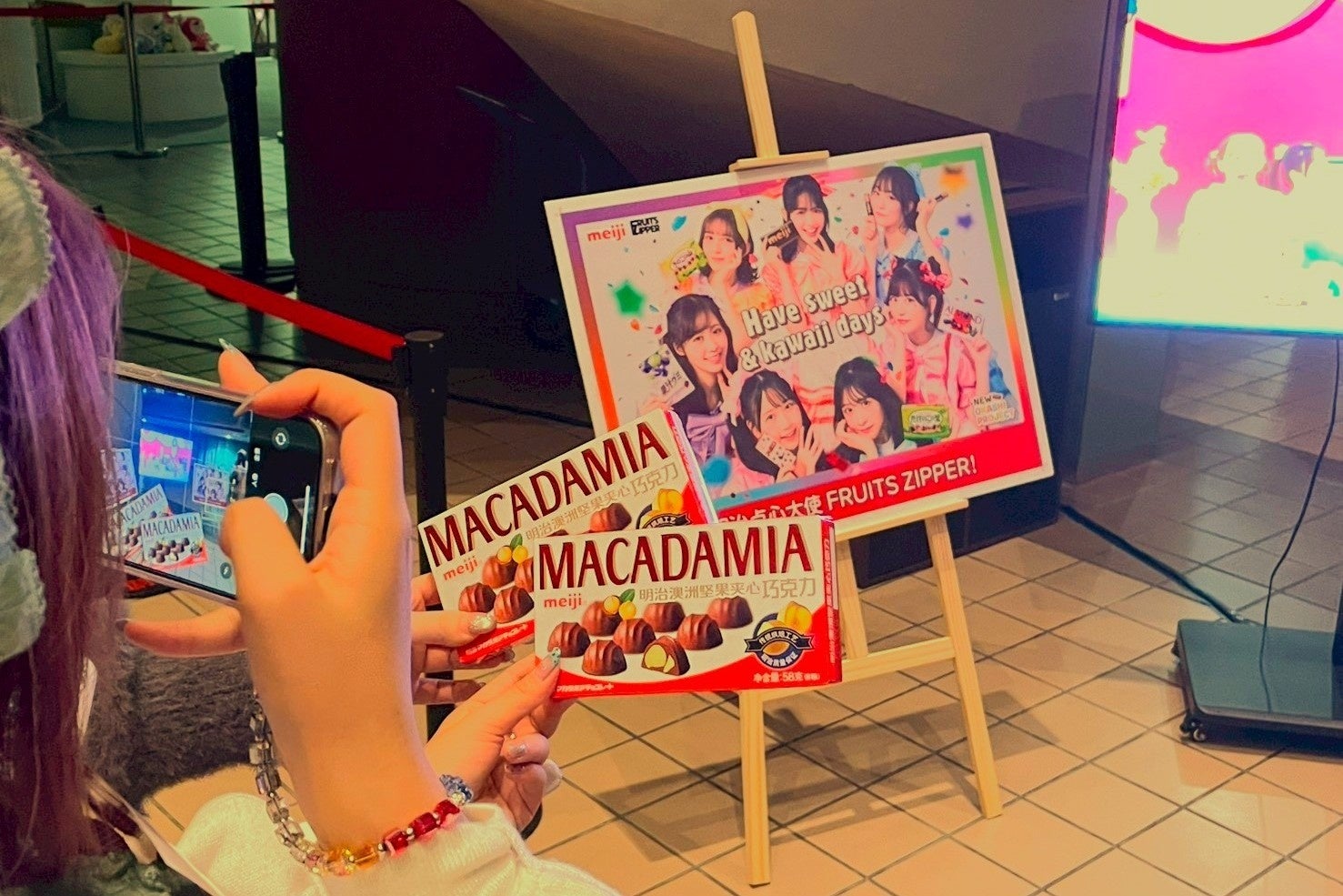 上海公演では、「マカダミアチョコレート」のサンプリングを実施。上海でも商品を片手に直筆サインパネル前で記念撮影を楽しむファンの姿が多く見られました。CM楽曲な流れる中、ライブ前後の会場は一層の盛り上がりを見せました。
