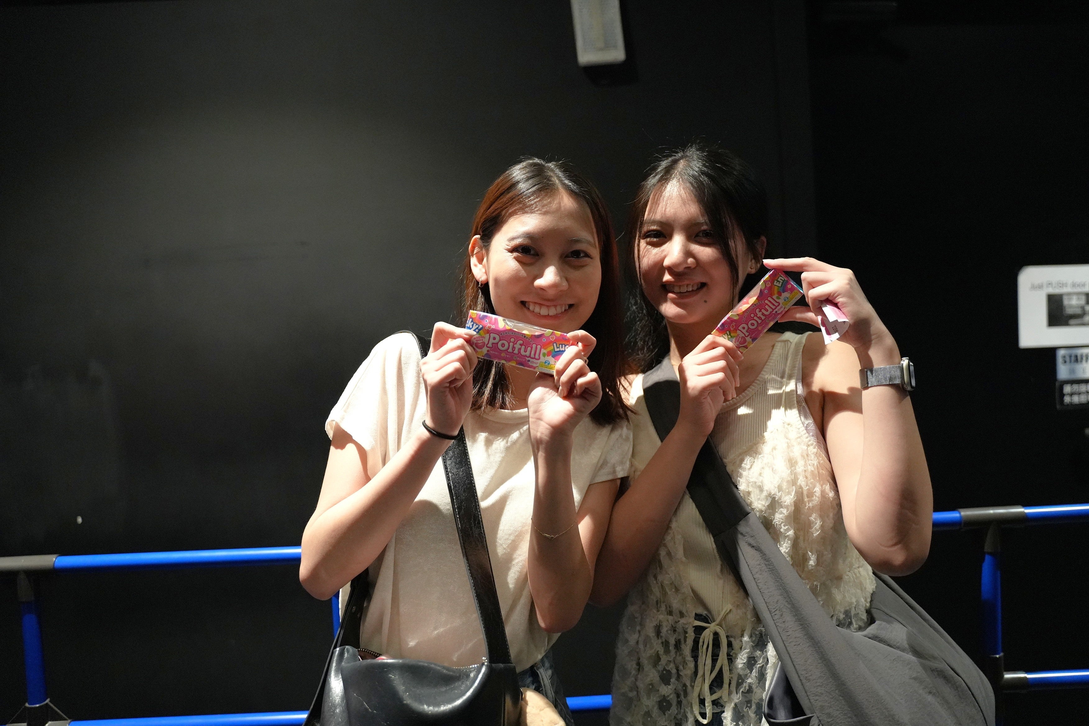 アジアツアー初日となる台北公演では、小粒ソフト糖衣グミ「ポイフル」のサンプリングを実施しました。会場内ではCM放映に加え、現地でFRUITS ZIPPERが直筆したサインパネルを設置。多くのファンが足を止め、受け取ったポイフルを手に写真撮影を楽しむ姿が見られ、賑やかな雰囲気が広がりました。