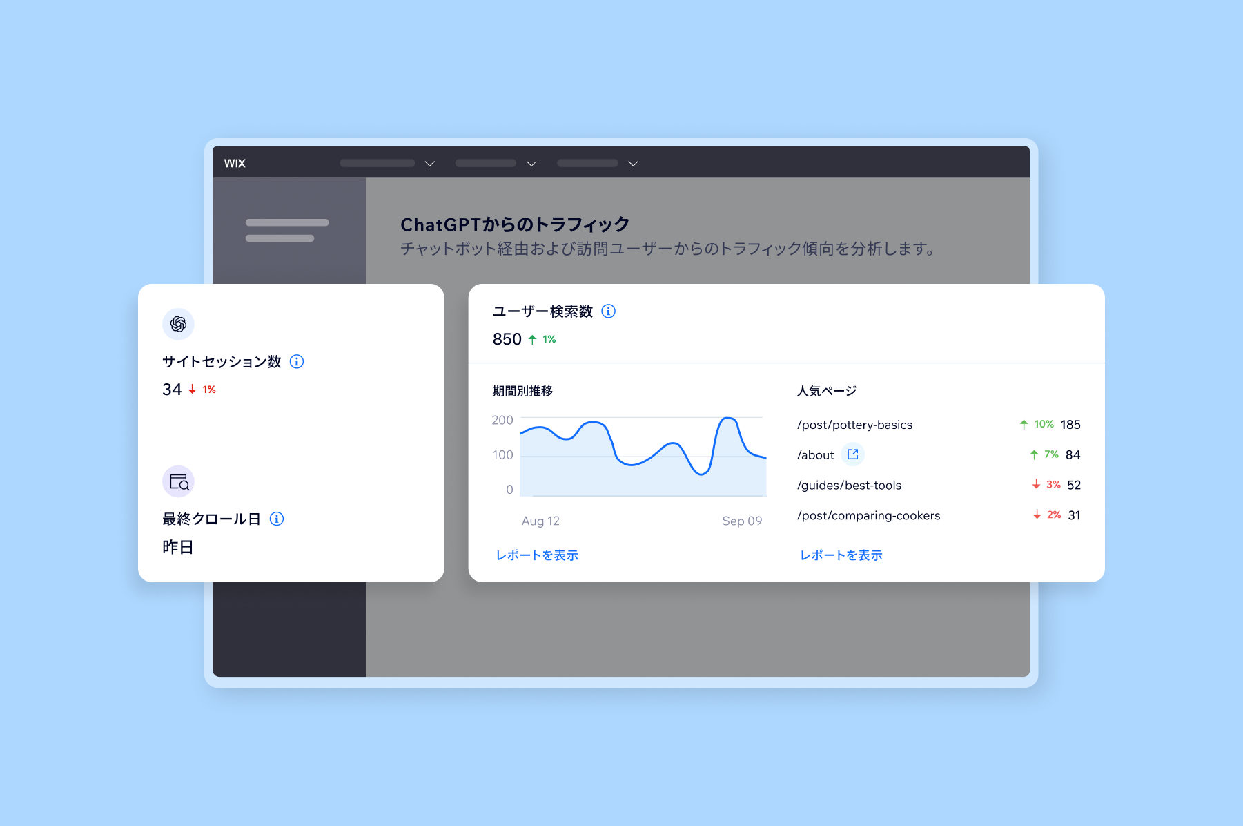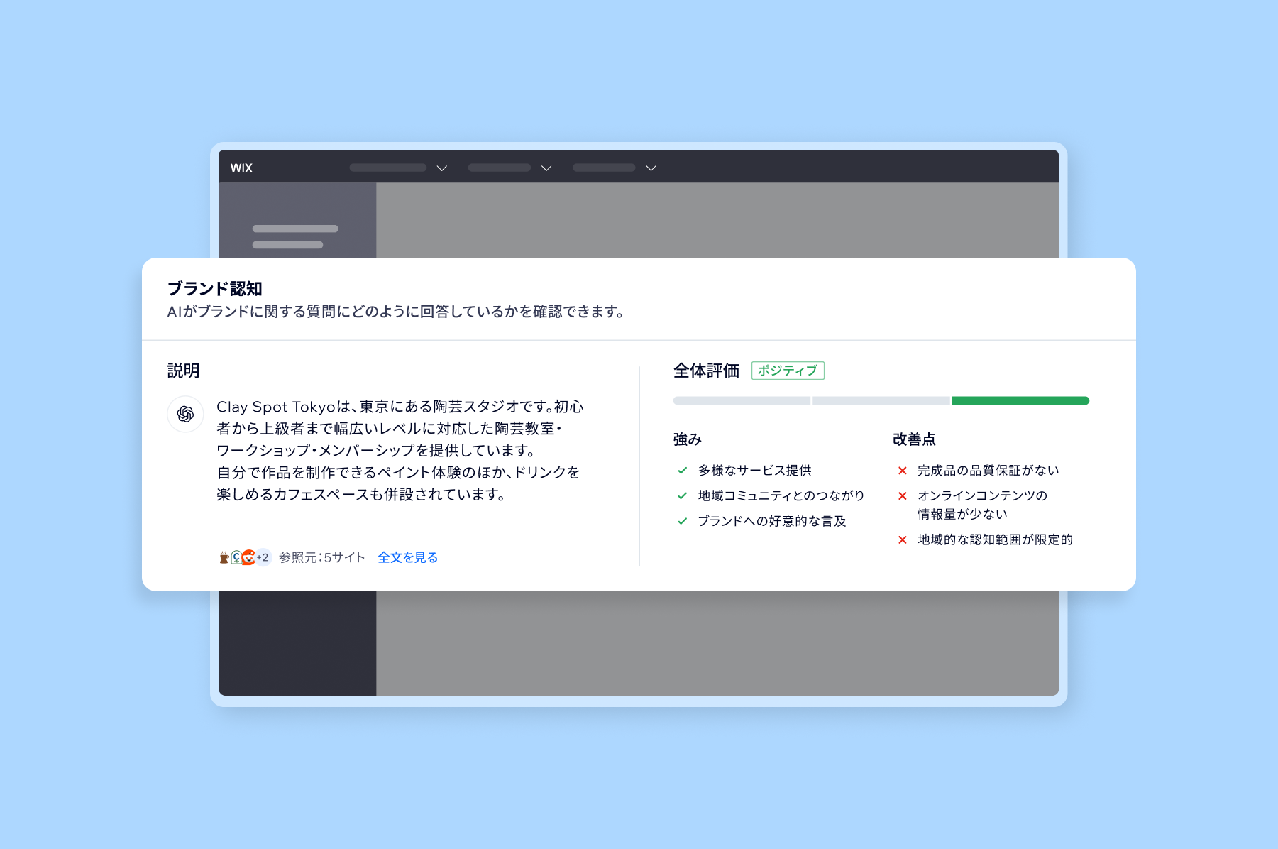 GEO/LLMO(生成 AI エンジン最適化、あるいは LLM 最適化)の重要性は近年高まっています。ユーザーが情報収集や意思決定をする際には、従来の Web 検索にとどまらず、LLM ベースの生成 AI を活用する傾向が見られます。このような「AI 検索」という新しい領域においては、ブランドや企業が AI による検索結果や回答でどのように引用されるかがこれまで以上に重要になってきました。Wix が提供する「AI 検索結果概要」は、この新たな検索環境下におけるブランドの認知・露出状況や競争環境を多角的に可視化し、戦略的に自社サイトとブランド価値を向上するための、GEO/LLMO 対策のひとつの新しい手段となります。
