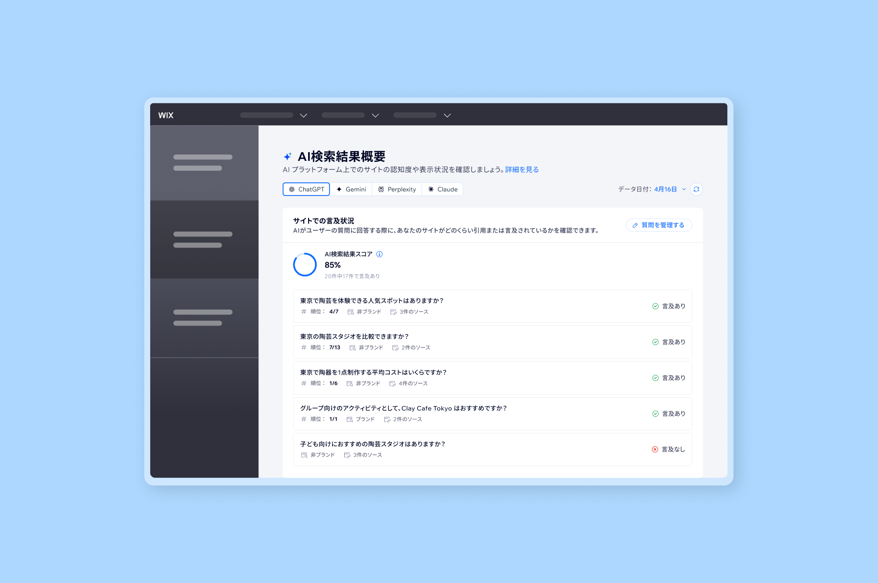世界有数の SaaS 型 Web 制作プラットフォーム* である Wix.com Ltd.(NASDAQ: WIX、以下 Wix)は本日、AI 時代における新たなブランド発見可能性を実現する革新的ソリューション「AI 検索結果概要(AI Visibility Overview)」の提供開始を発表しました。本ツールは、ChatGPT、Gemini、Perplexity、Claude などの主要な大規模言語モデル(LLM)の回答内容において、企業ブランドがどのように引用されるかを可視化、モニタリング、そして積極的に改善するためのアドバイスを提供します。AI が SEO とデジタルマーケティングの世界を再定義する中、ブランドが優位性を確立するための機能です。