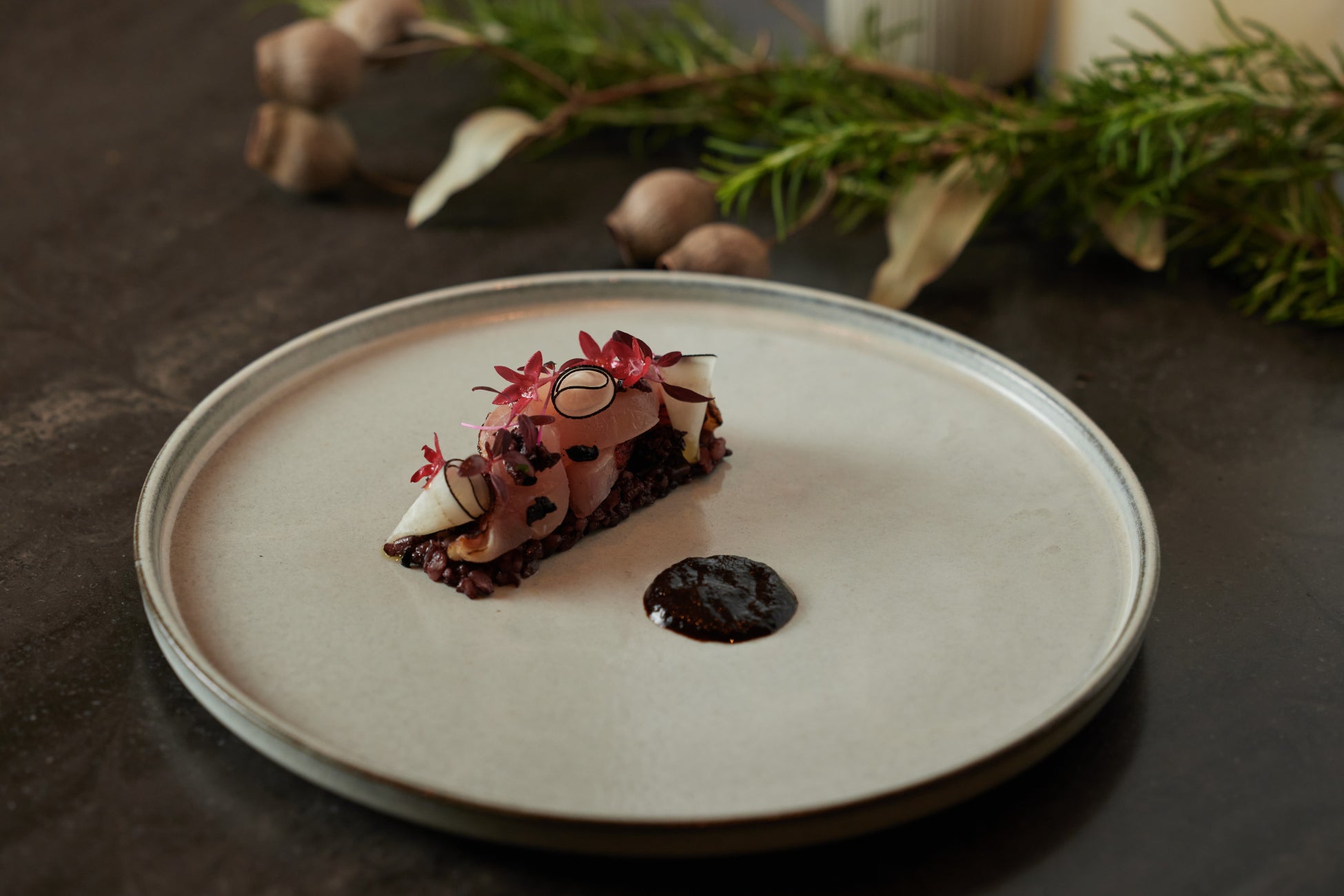 ・金目鯛と黒米サラダ 黒大蒜のソース