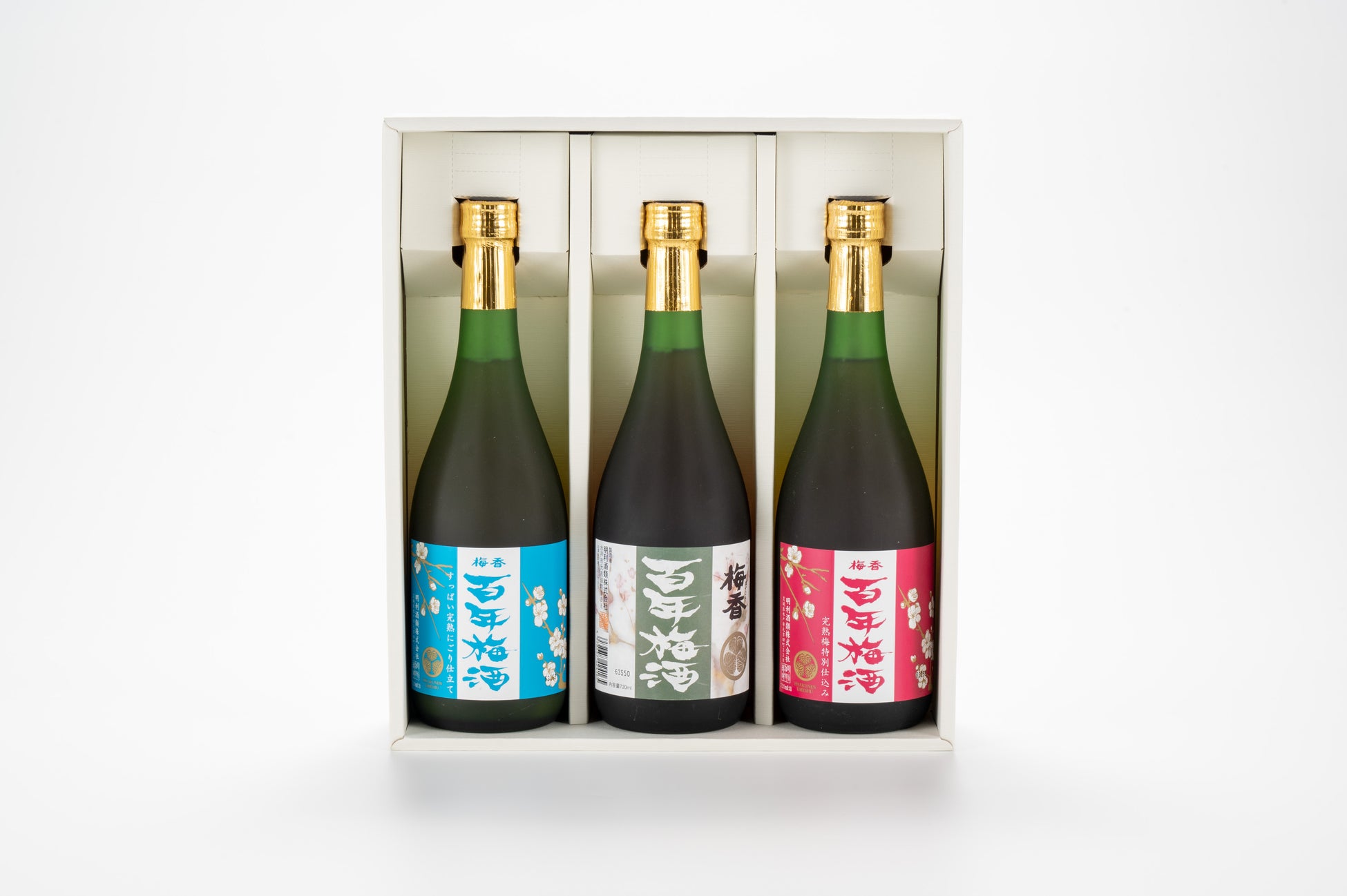 「百年梅酒 720ml」1本、「百年梅酒 完熟梅特別仕込み 720ml」1本、「百年梅酒 すっぱい完熟にごり仕立て 720ml 1本」の3本セット