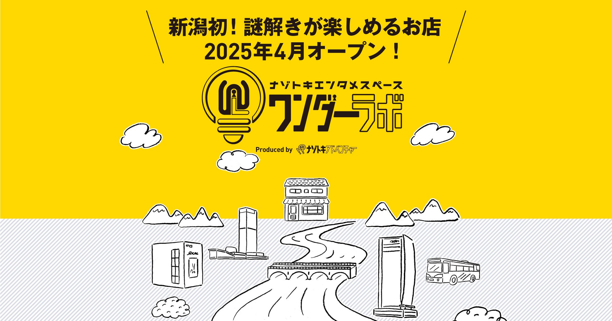 新潟で大人気の謎解きイベントシリーズ「ナゾトキアドベンチャー inメディアシップ」や、新潟都心エリア“にいがた2km”を観光しながら楽しめる謎解き「ロスト・イン・パラレルシティ」、さらに上越新幹線上り列車車両内で楽しめる「シークレット・エクスプレス」など、新潟発の謎解きイベントを多数手掛けるナゾトキアドベンチャーが、不思議や驚きで満ち溢れた謎解き・脱出ゲームイベントを楽しめる常設店舗、ナゾトキエンタメスペース「ワンダーラボ」を2025年4月にオープンします。