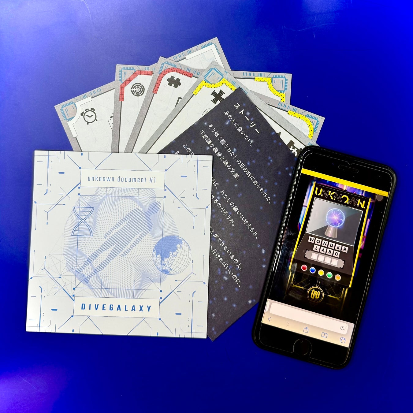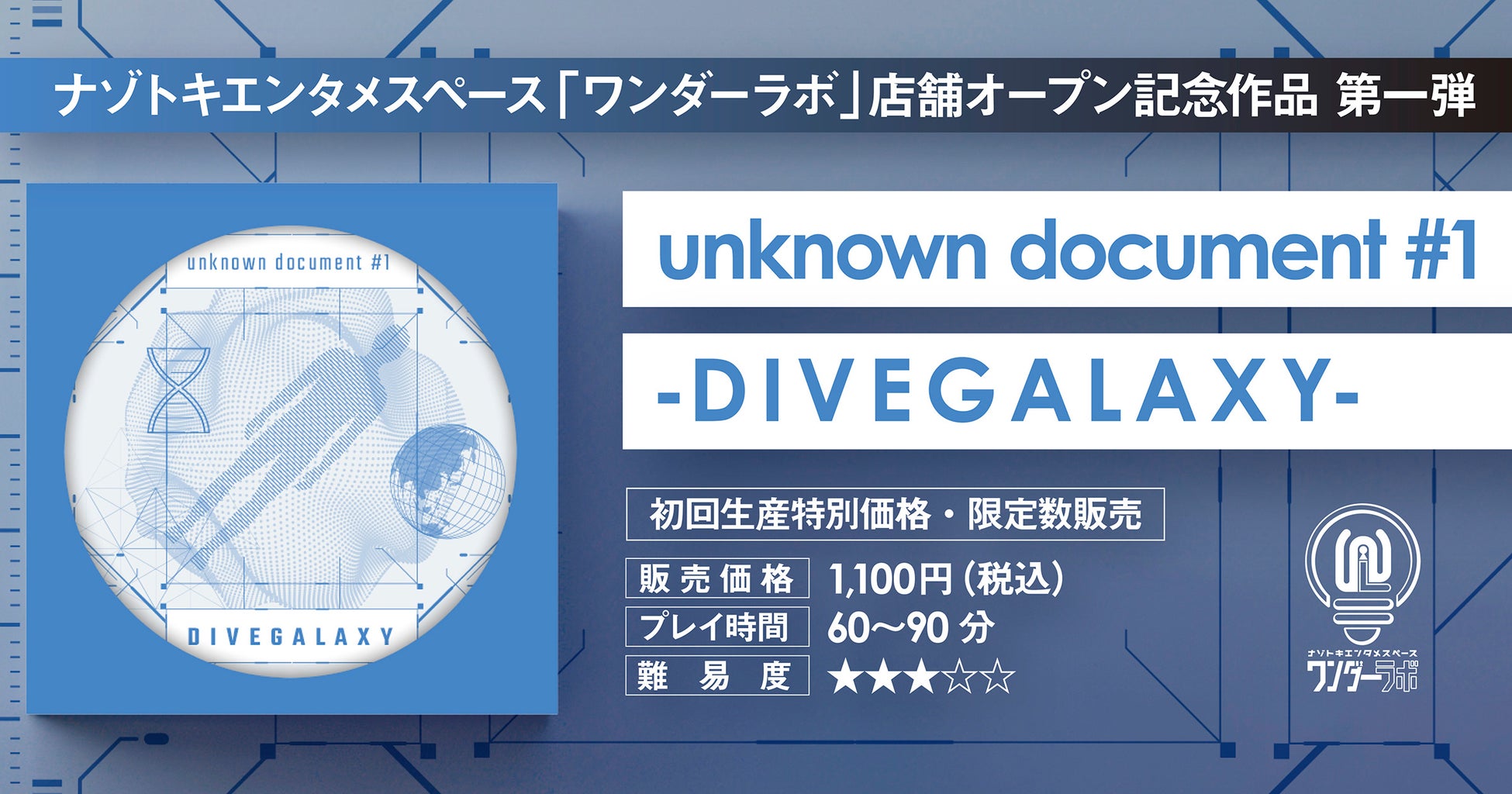unknown documentシリーズは、ナゾトキエンタメスペース「ワンダーラボ」の”不思議”をテーマにした謎解き作品シリーズとなっており、第一弾「D I V E G A L A X Y」は、とある女性の願いから、不思議な世界へと誘われる謎解きストーリーに。
