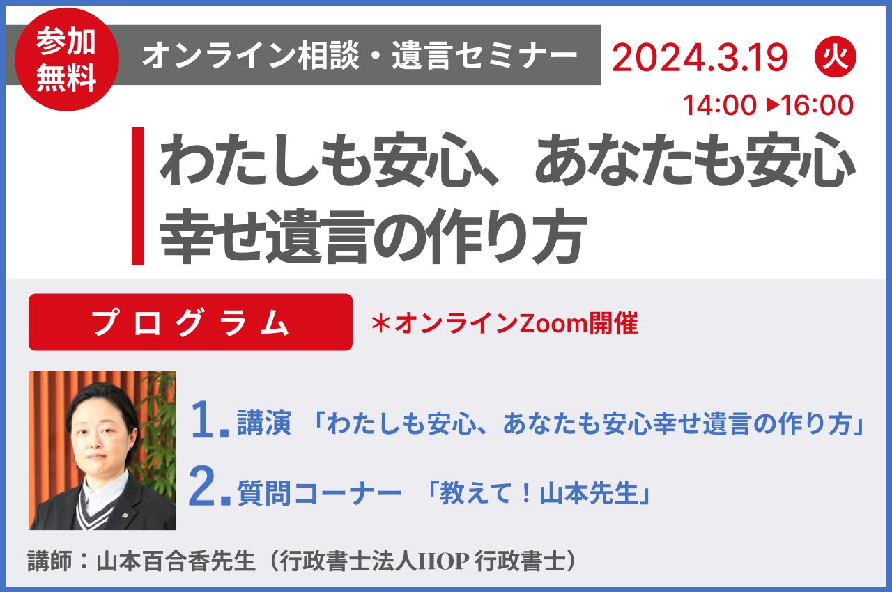 今回のセミナーでは、生前に家族で相続について話し合い、円満に後世に「想い」を引き継ぐために、遺言によって「想い」を残す術を具体的にお伝えします。争う相続を減らし、家族が幸せになる「笑顔相続」を目指して、さまざまな相談を受けている行政書士で上級相続診断士の山本百合香先生を講師に迎え、「幸せ遺言のつくり方」と題してお話しいただきます。
