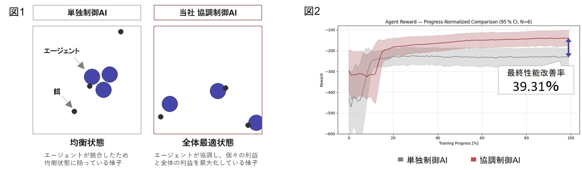 その結果、協調制御AIの最終報酬は単独制御AIと比較して39 %の相対的な性能改善が確認されました(図2)。