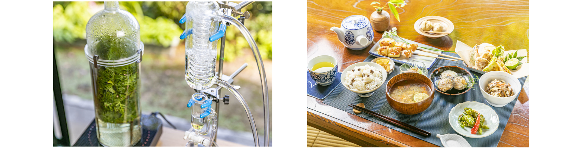 敷地内にあるハーブ畑で季節のハーブを摘み、アロマオイルを抽出する蒸留体験ができ、体験で採れた精油や芳香蒸留水はお土産として持って帰れます。