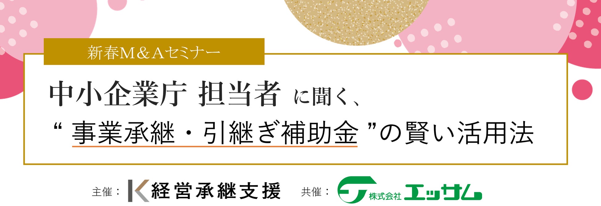 株式会社経営承継支援(本社:東京都千代田区、代表取締役社長:笹川敏幸)は、株式会社エッサム(本社:東京都千代田区、代表取締役社長:前原恵一)と共催で、中小企業に関する税制や事業承継支援策を担当されている中小企業庁の木村氏、白石氏を迎え、「事業承継・引継ぎ補助金」の活用法を解説するセミナーを開催します。東京・福岡の2会場で開催し、参加費は無料、事前の申し込みが必要です。(※本セミナーは会計事務所に所属されている方のみご参加いただけます。)