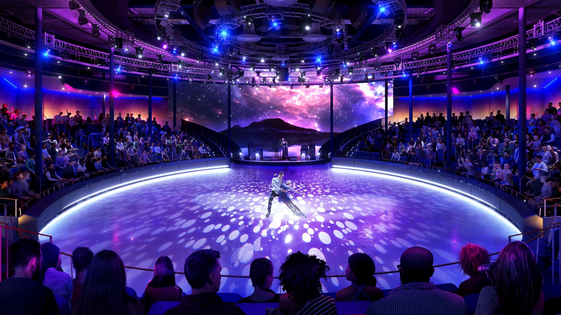 目抜き通りであるロイヤルプロムナードには、ロイヤル・カリビアン史上最も大胆なアイス・アリーナが登場します。最先端のテクノロジーと、元オリンピックメダリストが在籍していたこともある実力派エンターテインメントチームによるアイススケートショーは圧巻です。