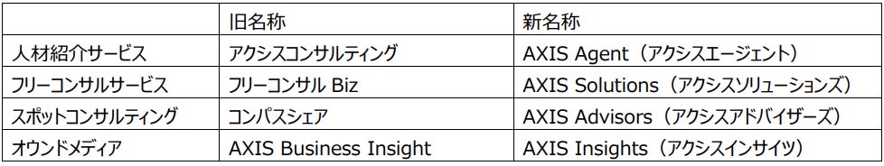 リブランディングに合わせ、以下のようにサービス名称も刷新・統一いたします。すべてのサービスを「アクシス」ブランドのもとに整理することで、ユーザーとの接点において一貫性のある体験と認識を実現します。なお、スポットコンサルティングサービス「コンパスシェア」は2025年7月下旬以降をめどに「AXIS Advisors(アクシスアドバイザーズ)へリニューアル予定です。