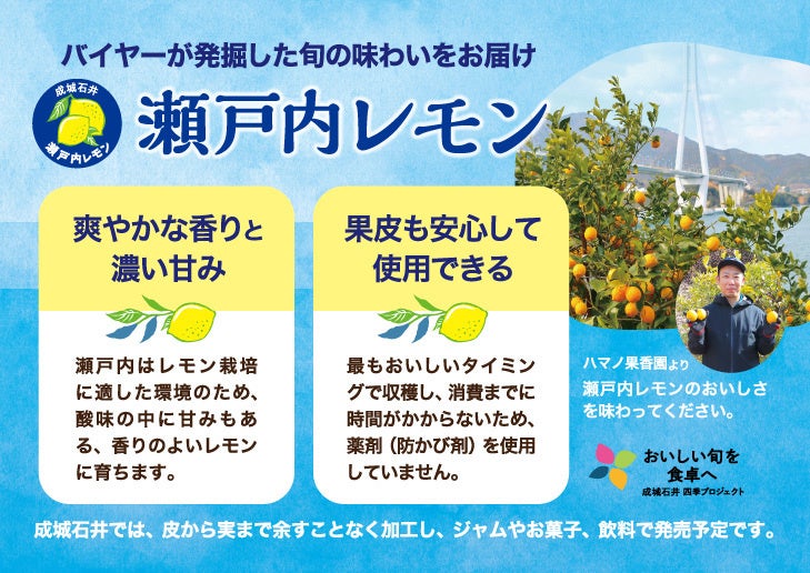 この瀬戸内レモンで春の旬を、夏・秋・冬にもそれぞれの季節に旬を迎える魅力的な食材を発掘、魅力的な商品を開発し、日本の四季の旬をお届けしてまいります。また、生産者様と直接対話ができる成城石井だからこそ、サスティナビリティの観点を踏まえた食材選びを通して、地域へも貢献ができる取り組みを展開してまいります。