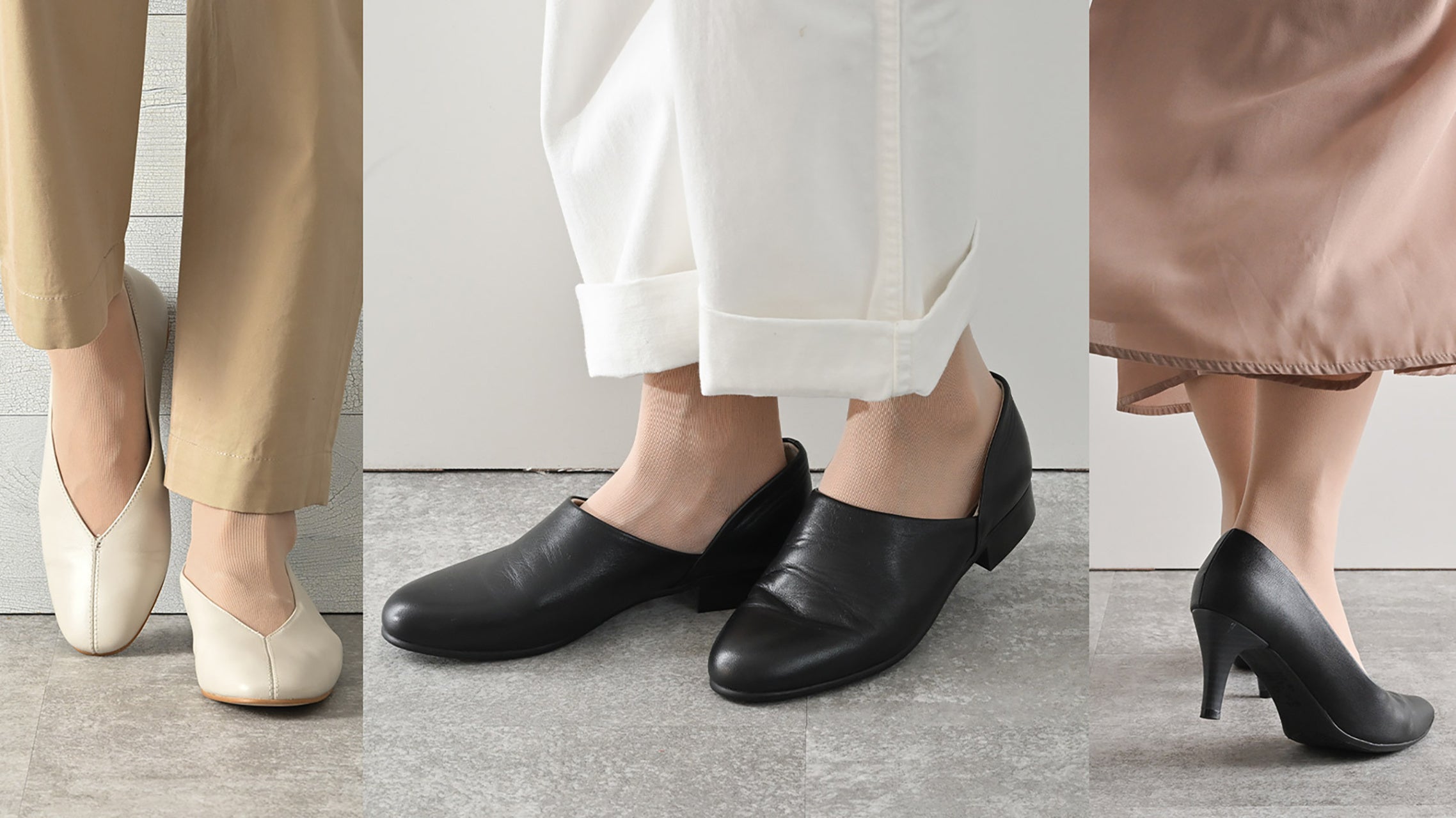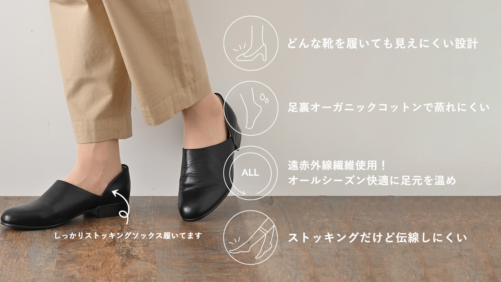足裏のコットン部分は面積をできるだけ小さくし、どの角度からも見えないように。パンツスタイル、スカートスタイルどちらにも合わせやすく、履物の邪魔をしません。