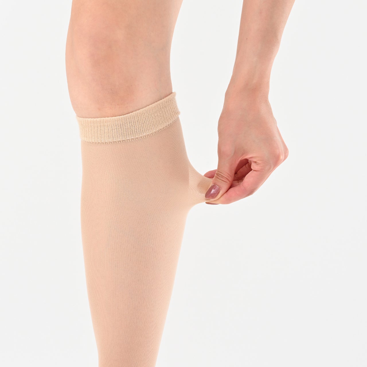 足先、足裏、かかと部分の素材はオーガニックコットン。 天然繊維が汗を吸収し、蒸れにくく快適な履き心地に。ストッキングに使われるナイロン糸と異なり、吸水性の高いコットンを使用しているため、足の汗を原因とするニオイも防ぎます。