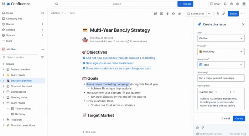 AIによるタスク作成機能は、ConfluenceのページからJira内のタスクを簡単に特定し作成するものです。テキストをハイライトするだけで、ページから直接作成できるタスクをAIが提案します。他にも、Slackのメッセージからワークアイテムを作成したり、AIを使用してConfluenceのページ全体をスキャンし、アクションアイテムを一括で複数のワークアイテムに変換することが可能です。