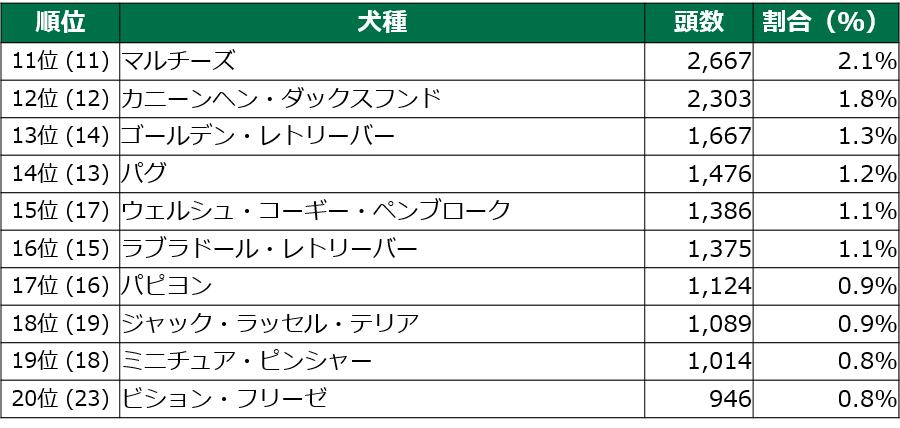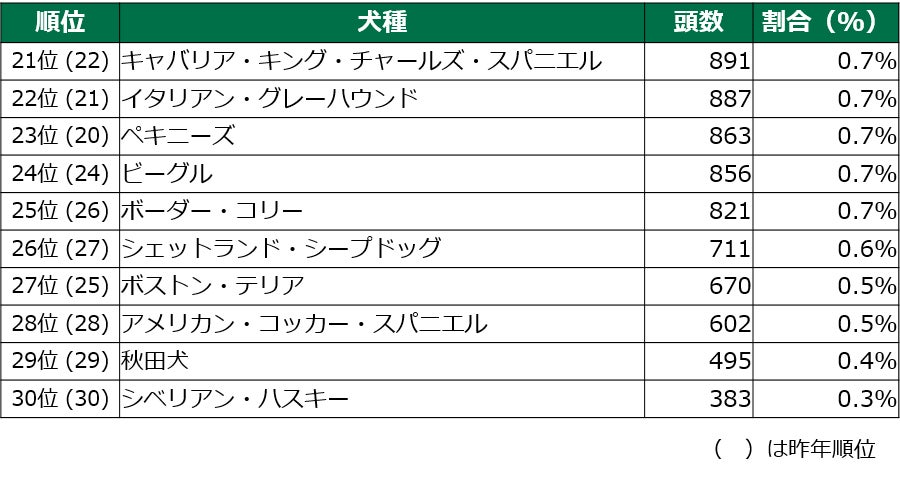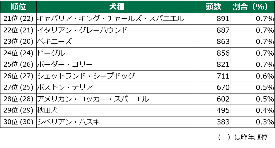 トップ10圏内で唯一変動があったのは、5位ミニチュア・ダックスフンド(昨年6位)と6位ポメラニアン(昨年5位)のみで、昨年同様の犬種がランクインしています。このうち中型犬は柴犬とフレンチ・ブルドッグの2犬種のみで、小型犬人気が続いています。