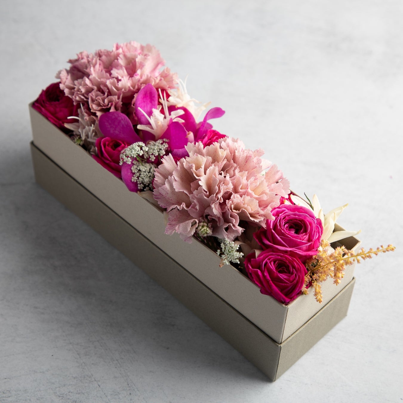 そして、スイーツと同じRESTAURANT DAZZLEの箔押しが施された、高級感のあるBOXの中で輝きを放つのは、ピンクやワインカラーなどコントラストで美しくアレンジした花々。母の日の象徴であるカーネーションを中心に、愛を伝える薔薇などを組み合わせ、優美さと存在感を兼ね備えたデザインに仕上げました。