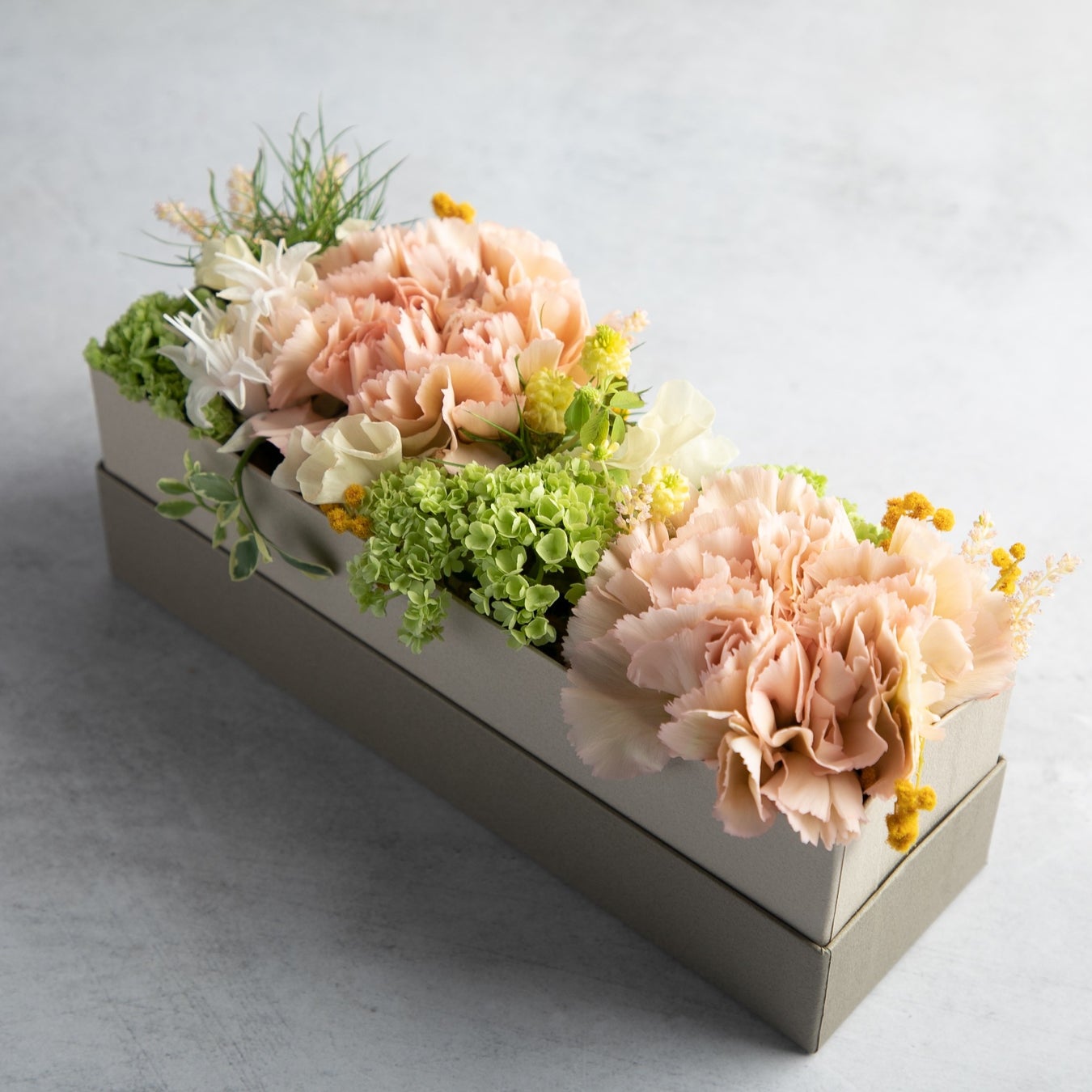 ピンクのカーネーションを中心にナチュラルで柔らかな印象のアレンジメント。