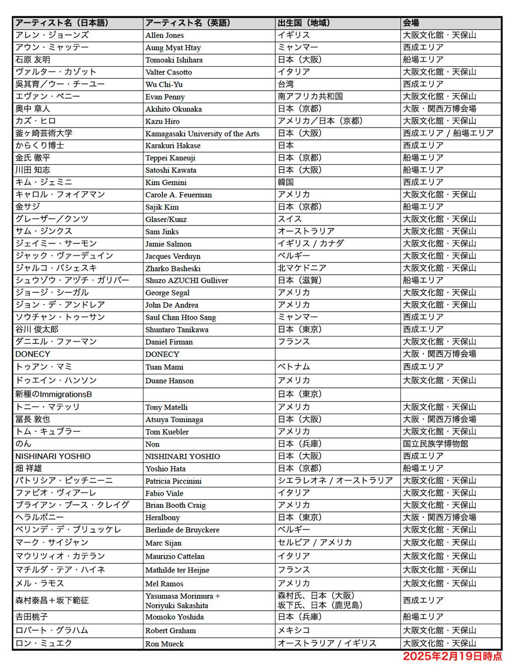 会場:大阪・関西万博会場内 / 大阪文化館・天保山(旧サントリーミュージアム)・ベイエリア / 中之島エリア(大阪府立国際会議場)、船場エリア / 西成エリア / 大阪キタエリア / 松原市ほか