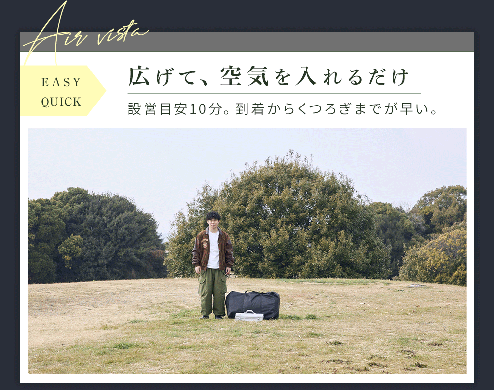 本製品は、大型テントならではの快適な居住性を備えながら、空気を入れて設営できるエアフレーム構造を採用したモデルです。設営時の負担を軽減し、より手軽にキャンプを楽しめるテントとして開発いたしました。快適な居住空間と扱いやすさの両立を目指し、設営や撤収の負担を抑えることで、キャンプ本来の楽しみである“外で過ごす時間”をより豊かにする一張りに仕上げています。