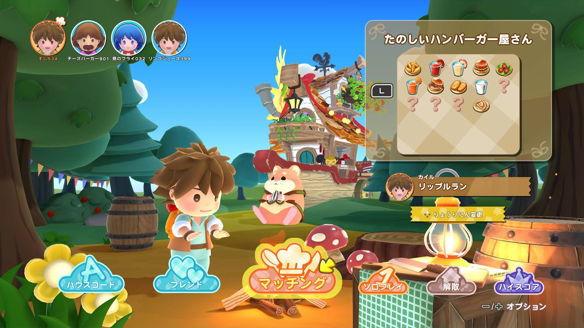 ハプニングだらけのドタバタクッキング体験ができる「みんなでレストラン」モード。プレイヤーは「キッチン」「ホール」「ファーマー」「トレジャー」に分かれて協力!食材集め、料理作成、お客さんへお届け、 ホールの掃除やペットのお世話も待ち受けます!