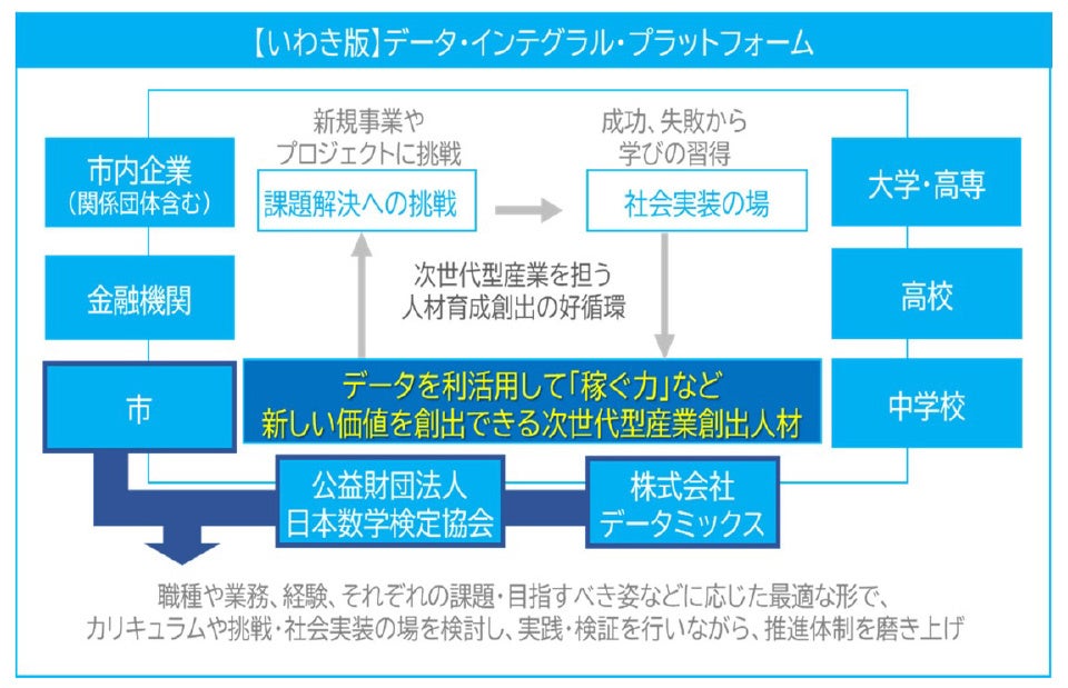 いわき市では、これらの人材を育成し、同市の産業界における⽣産性向上や経営⼒強化を⽀える「デジタル⼈材の育成モデルの構築」を目指して、データミックス・日本数学検定協会と連携協定を締結しました。数学⼒やデータサイエンス⼒の底上げを図る専⾨的で多様なカリキュラムを、地域の産学官が提供するフィールドで実践・検証を行い、いわき市の産業界に適したカリキュラムや推進体制を構築することを目指します。