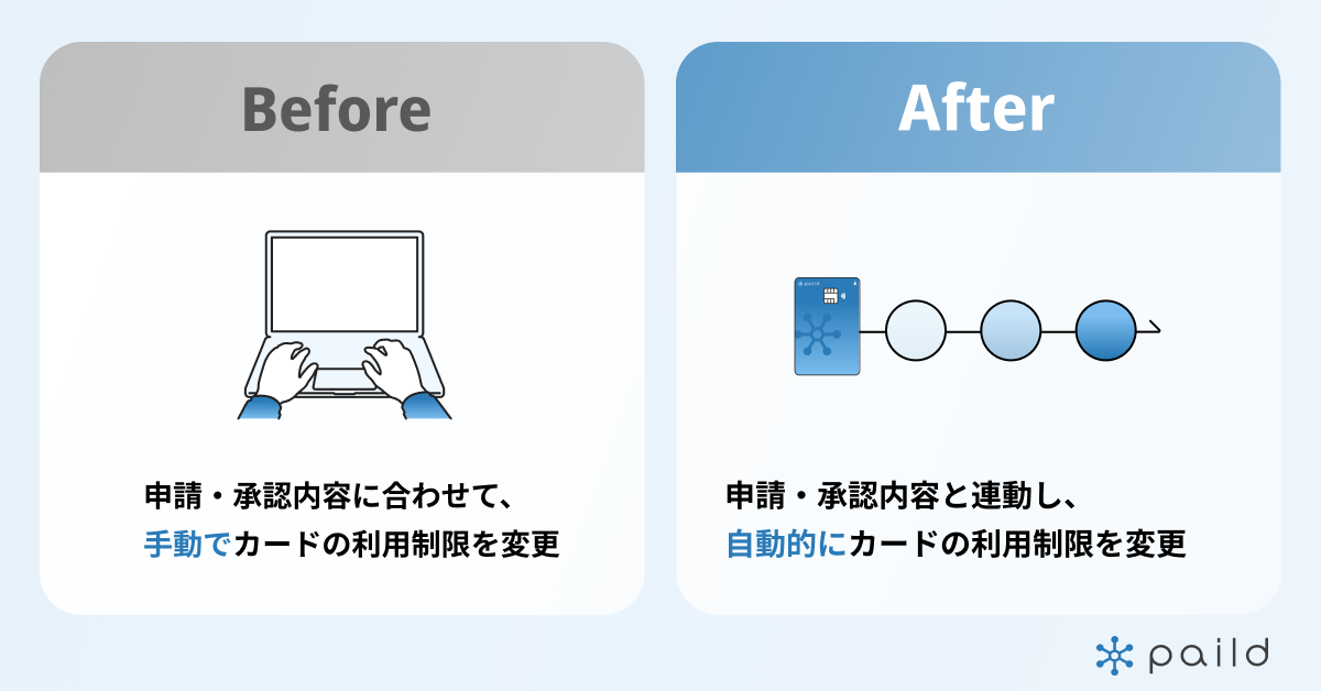 今回リリースした特許出願中の新機能により、paildのワークフローとカードを自動連動させ、paildワークフローで申請・承認された内容に基づき、自動的にカード利用制限を変更できるようになりました。
