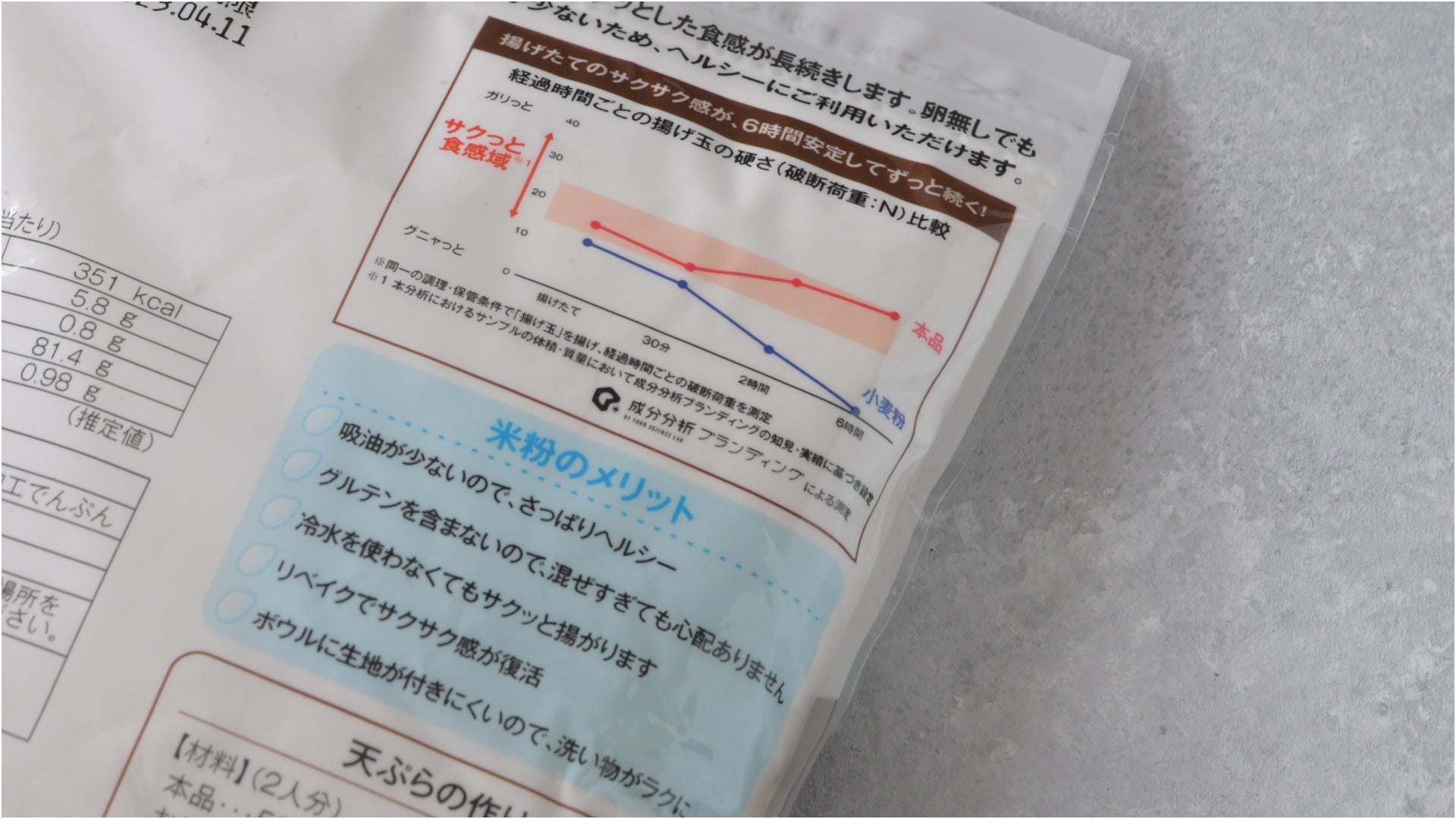 波里の米粉で作った天ぷらは時間経過しても硬度が保たれていることから、波里の米粉はサクッと感が持続される天ぷら粉であることが明らかとなりました。理由として、米粉で作った天ぷら衣が油を吸収しづらいということが挙げられます。米粉は吸油率が低いため、時間経過による油の滲出が少なく、サクッと感が維持されます。一般的に米粉の吸油率は小麦粉に対して25%程度低いとされています。