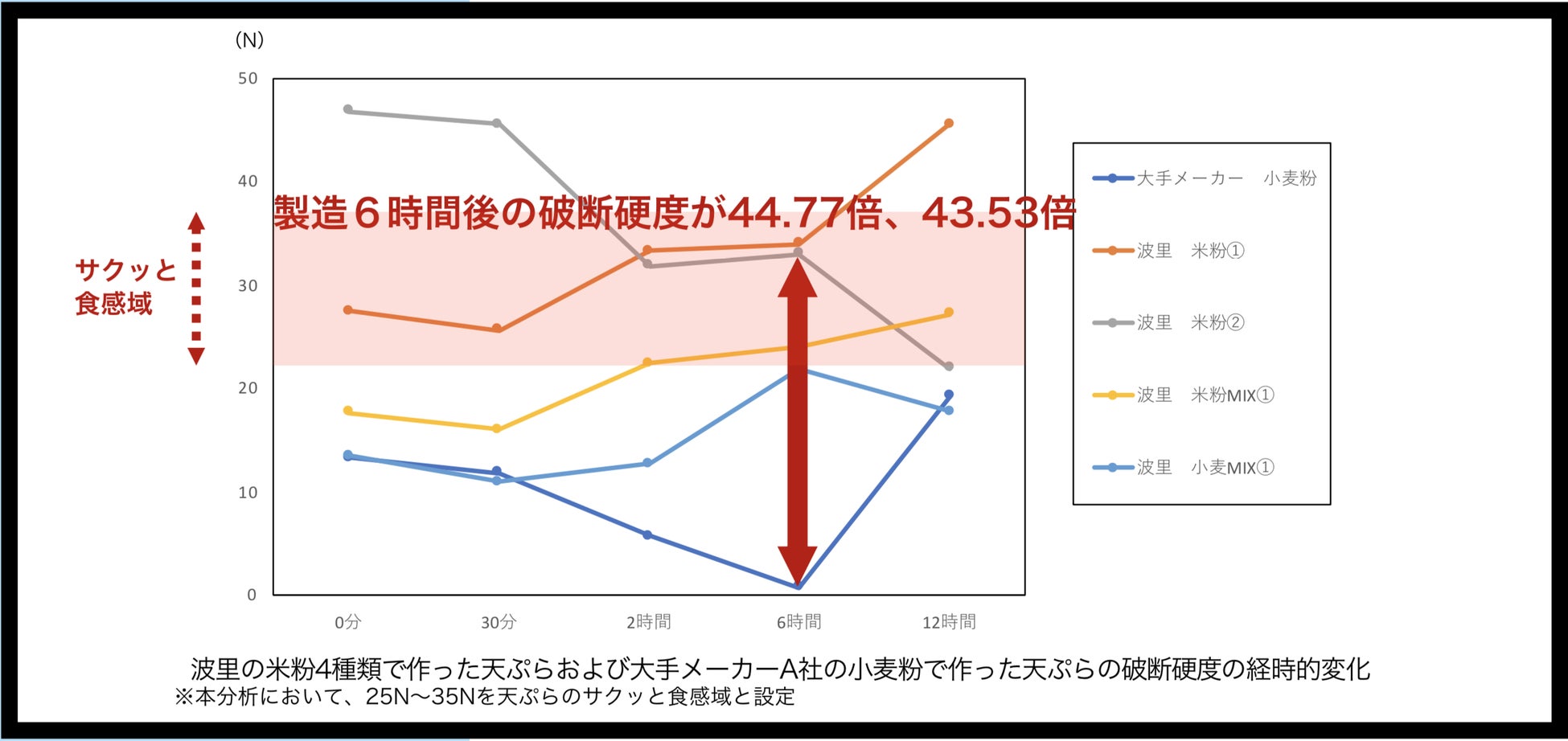 波里の米粉で作った天ぷらは、一般的な小麦粉で作った天ぷらと比較して、製造6時間後の破断硬度が43.53〜44.77倍高い。