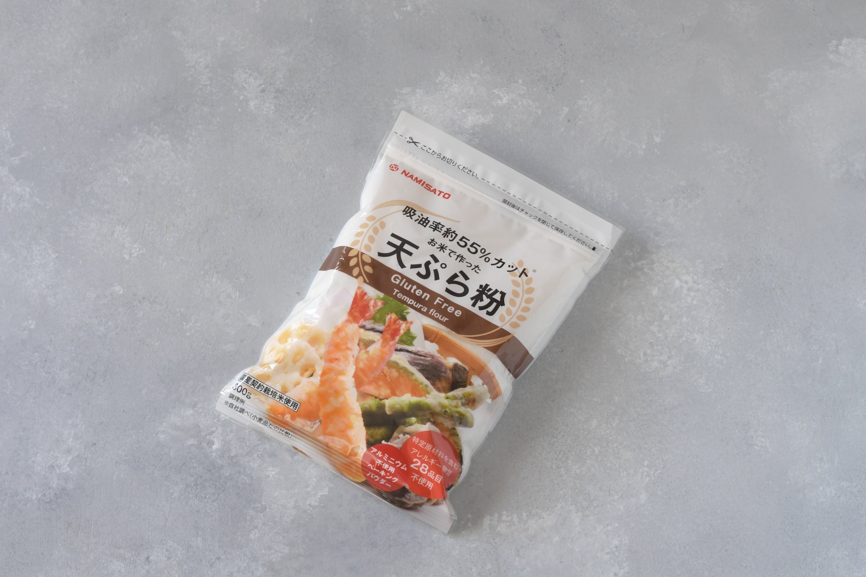 そんな米粉の使用方法として最近特に注目されているのが天ぷらです。一般的に米粉は小麦粉と比べて吸油率が25%程度低いとされており、グルテンを含まないのも特徴です。そのため、揚げ物がベタッとすることなくサクッと軽く、さらにさっぱりヘルシーに仕上がります。このような評判を受けて、波里では今年2月に「お米で作った天ぷら粉」をリリース。天ぷらに最適な細かさに製粉した国産米粉を主原料に、ふっくらと仕上げるでんぷんなどを加え、使い勝手のよい天ぷら粉を開発しました。「お米で作った天ぷら粉」を使った天ぷら作りは驚くほど簡単です。まず材料は「お米で作った天ぷら粉」と水のみ。卵は不要です。グルテンを含まない米粉は固まりづらくサラサラしているので、ふるいにかけなくてOKというのも嬉しいポイント。さらに水と混ぜても粘りが出ないので、冷水を用意する必要も、粉と水の混ぜ具合に悩むこともありません。そうしてできた衣液にお好みの具材をさっとくぐらせ、あとは普通の天ぷら同様に170~180℃の油で揚げるだけ。小麦も卵も使わないので、アレルギーの方も安心して天ぷらが楽しめるうえ、近年注目されているグルテンフリーにも対応しています。米にはアミノ酸が含まれているため、自然な旨味がプラスされるのも米粉の天ぷらならではの魅力です。
