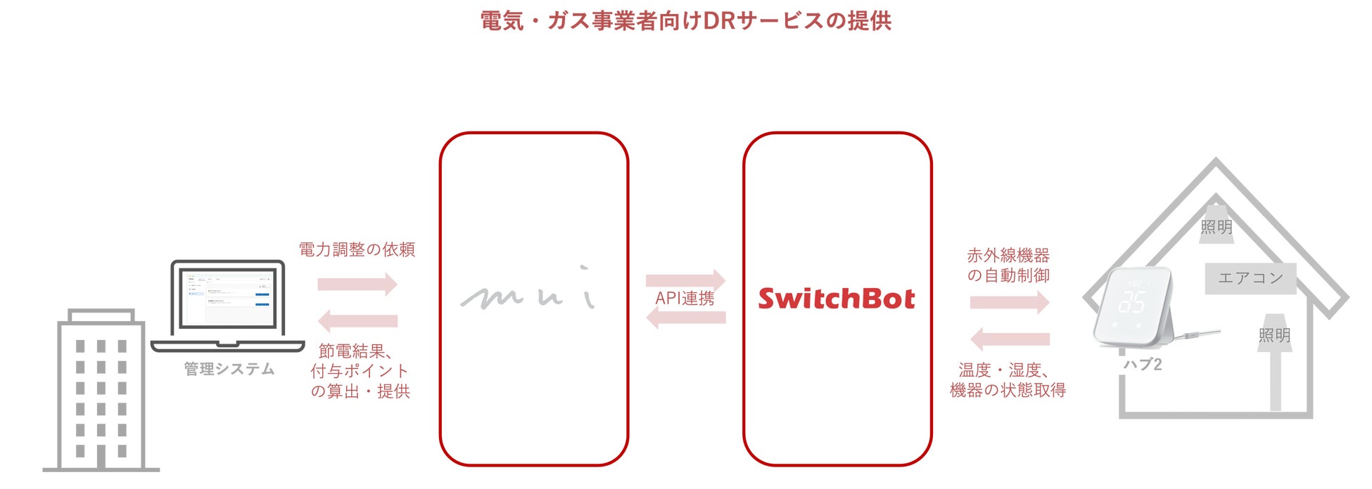 エネルギー事業者向けにスマートホームとDRサービスを一体化したサービスを提供します。mui Labが持つ事業者向けDRサービスの知見と実績に、スマートホーム/IoTに強みを持つSwitchBotの技術が融合することで、機器制御型DRサービスの提供を予定しています。