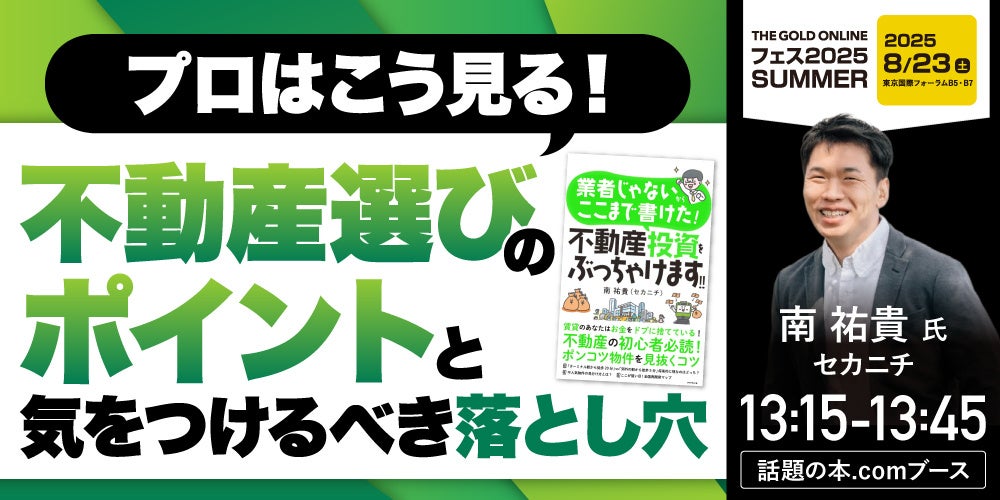 総フォロワー数は10万人超!南 祐貴(セカニチ)氏『プロはこう見る!不動産選びのポイントと、気をつけるべき落とし穴』8/23(土) 会場限定セミナーのお知らせ|THE GOLD ONLINE フェス