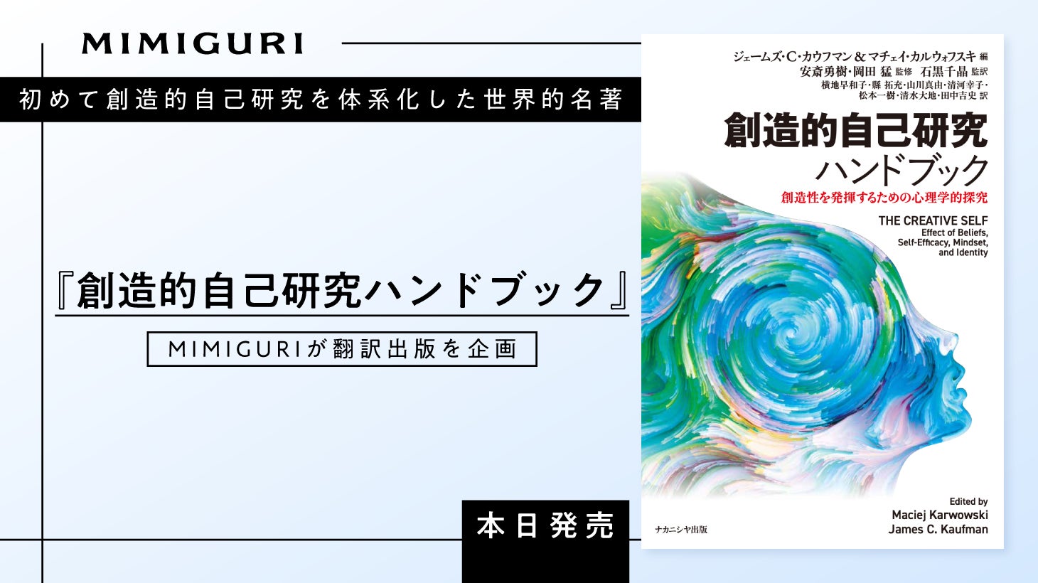 株式会社MIMIGURI(本社:東京都文京区、代表取締役Co-CEO:ミナベトモミ、安斎勇樹)は、世界の創造性研究の最前線で注目される「Creative Self(創造的自己)」の体系的学術書『The Creative Self: Effect of Beliefs, Self-Efficacy, Mindset, and Identity』 の翻訳出版を企画し、『創造的自己研究ハンドブック:創造性を発揮するための心理学的探究』 として、2026年4月8日(水)に株式会社ナカニシヤ出版より刊行いたします。
