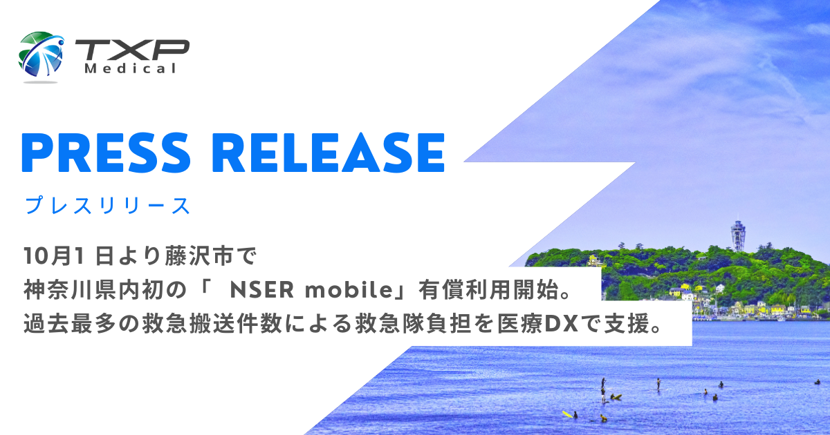 2022年12月1日より藤沢市ではTXP Medicalの救急搬送支援システムである「NSER mobile」を利用し、「救命効果を向上させるためのシステム構築」をテーマとした「傷病者情報管理システム」の実証実験を藤沢市消防局と実証研究参加医療機関(藤沢市民病院、藤沢湘南台病院、湘南藤沢徳洲会病院、湘南鎌倉総合病院)にて実施していました。10か月の実証の結果、救急搬送支援業務において効果と実績が認められ、藤沢市全域でのNSER mobile本格導入が2023年10月1日より決定しました。藤沢市では病歴やバイタルサインの情報や静止画などの救急医療におけるデータプラットフォームにおける必須情報に加えて動画情報の共有も可能です。この機能は他地域ではない、藤沢市独自の機能です。