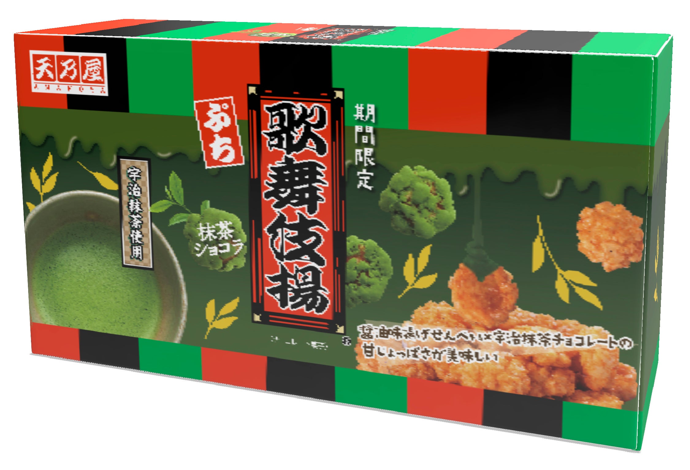歌舞伎揚は、香ばしく揚げた歌舞伎の家紋入り生地に天乃屋秘伝の甘口しょうゆタレで味付けした風味豊かな揚げせんべいで、1960年発売から皆様に愛されてきたロングセラー商品です。この歌舞伎揚が一口サイズになった「ぷち歌舞伎揚」に宇治抹茶を練り込んだ抹茶チョコレートをコーティングする事で、歌舞伎揚のしょうゆタレの味わいと、甘いチョコレート、ほろ苦い抹茶の味わいが複雑ながら、くせになる美味しさに仕上がっています。